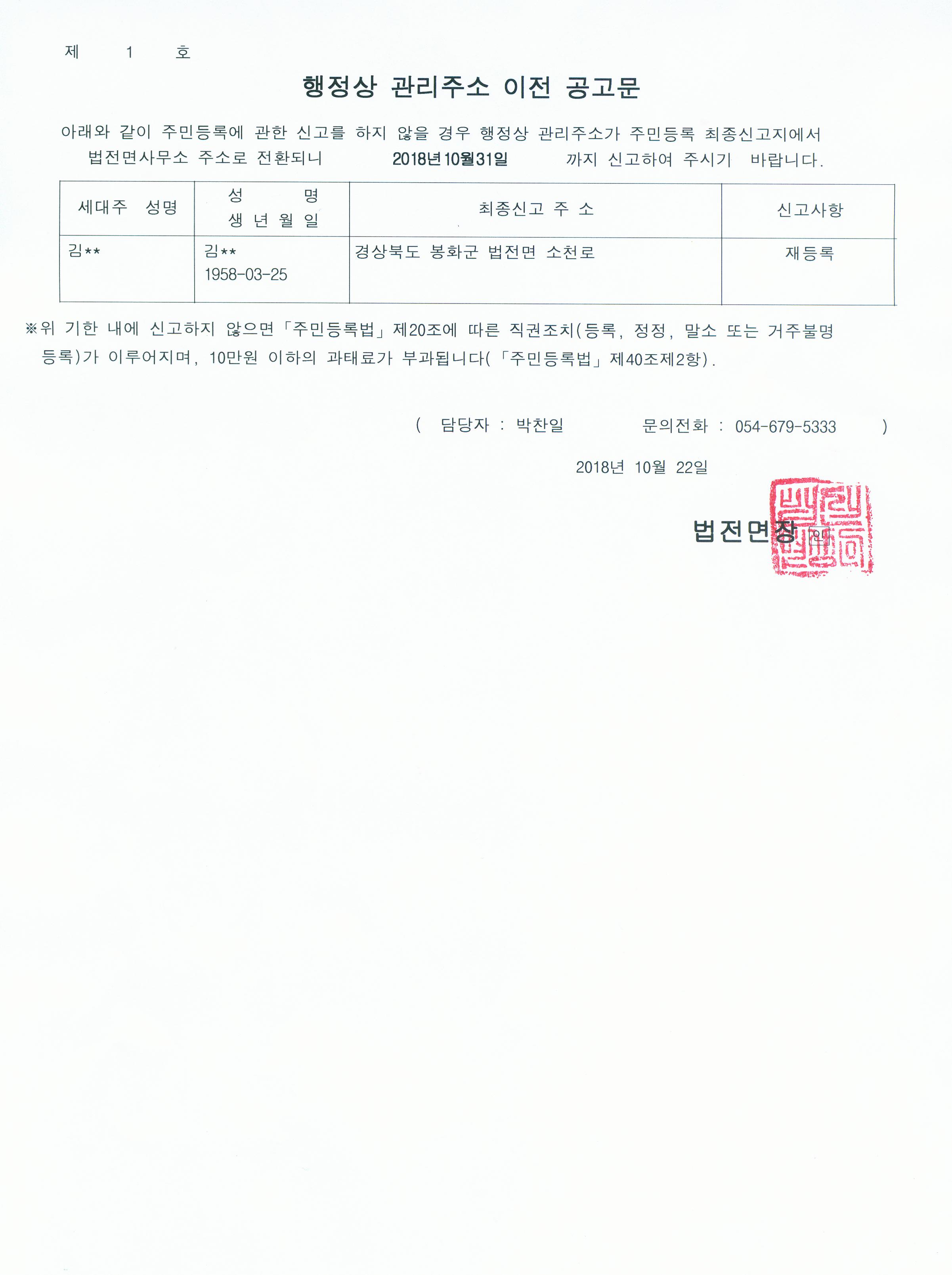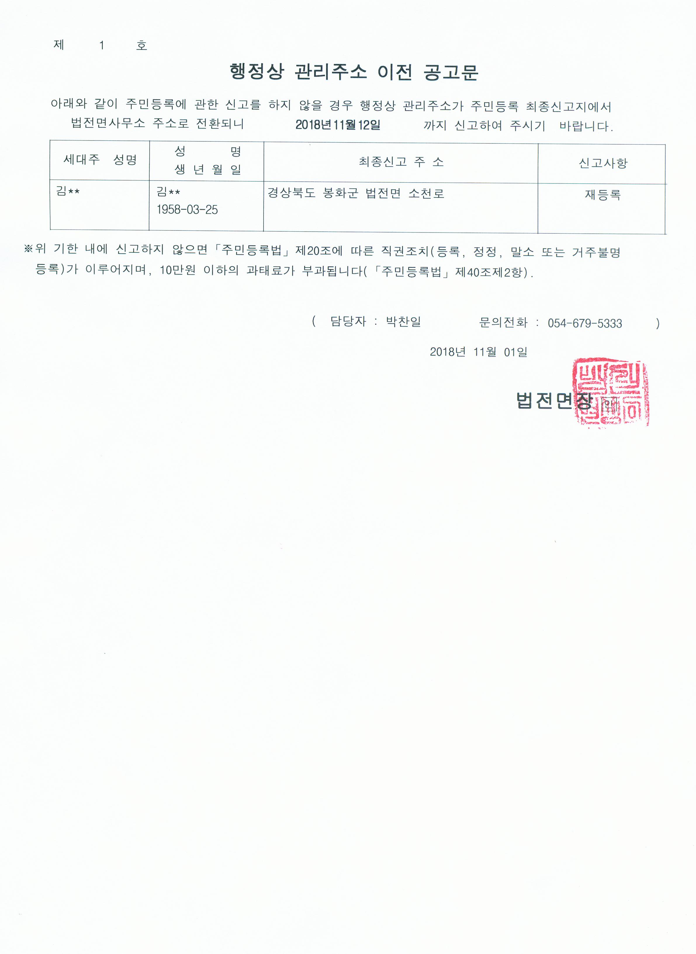 | 391 | 행정상 관리주소 이전 공고문 게시 | 박기영 | 2018.10.22 | ![]() | 343 |