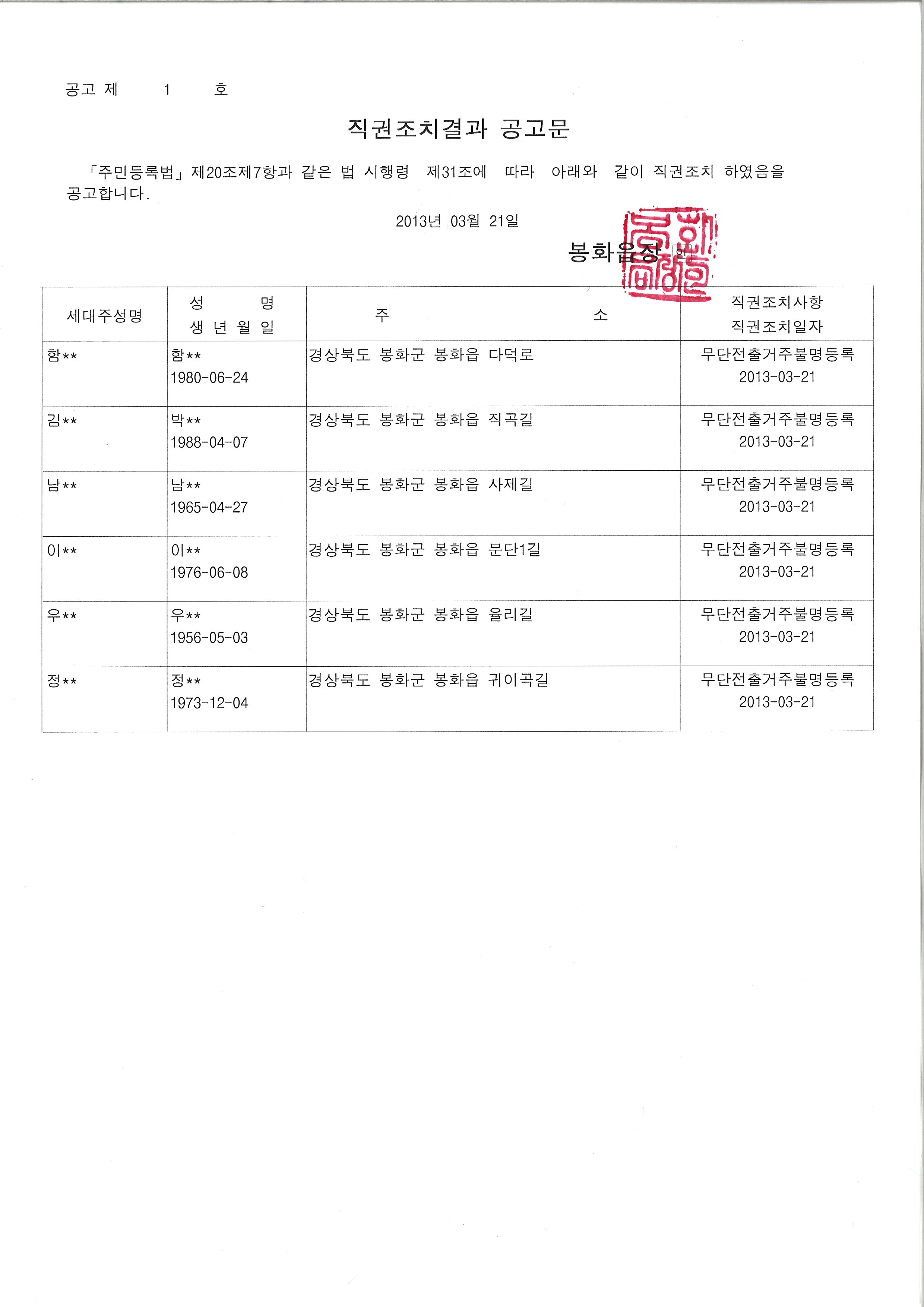 ■ 2013년 주민등록 일제정리 직권조치결과 공고문