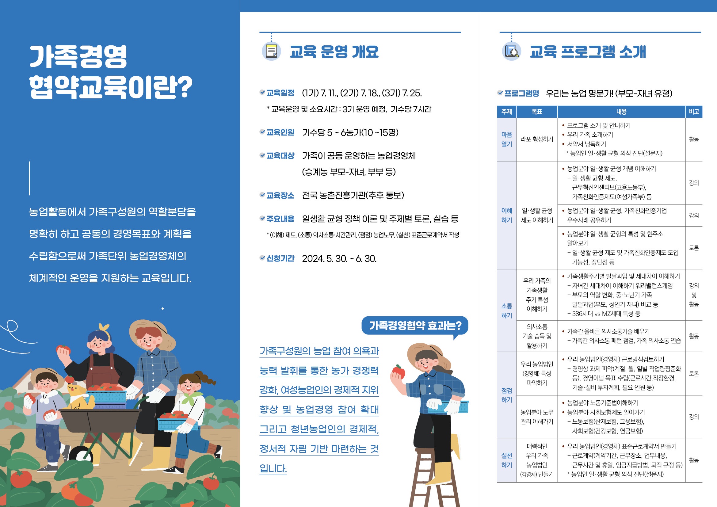 가족공동운영 농업경영체를 대상으로 가족구성원들의 역할을 명확하게 하고, 능력을 발휘할 수 있는 환경을 조성하기 위한「가족경영협약 현장교육」을 아래와 같이 추진하니, 교육을 희망하는 농업인의 많은 참여바랍니다.