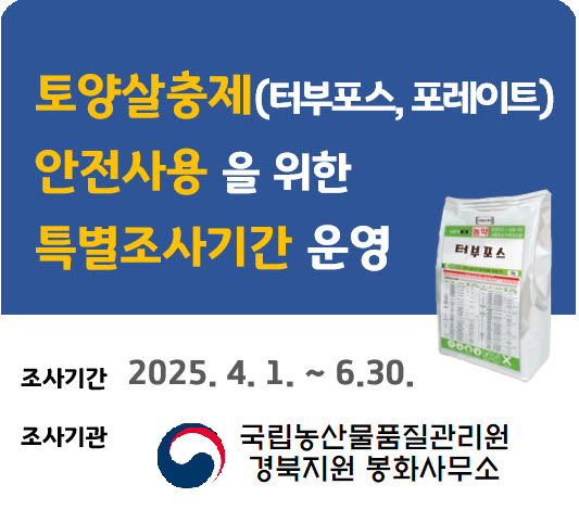 국립농산물품질관리원에서 토양살충제(터부포스, 포레이트 등) 안전사용을 위한 특별조사기간(2025.4. ~ 6월)을 운영을 합니다.
