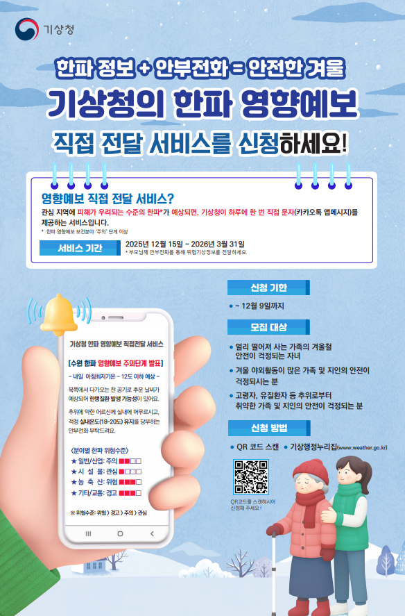 한파영향예보 신청기한은 12월9일까지이며 포스터에 QR코드 스캔이나 기상행정누리집(www.weather.go.kr)으로 신청해주시면됩니다 감사합니다