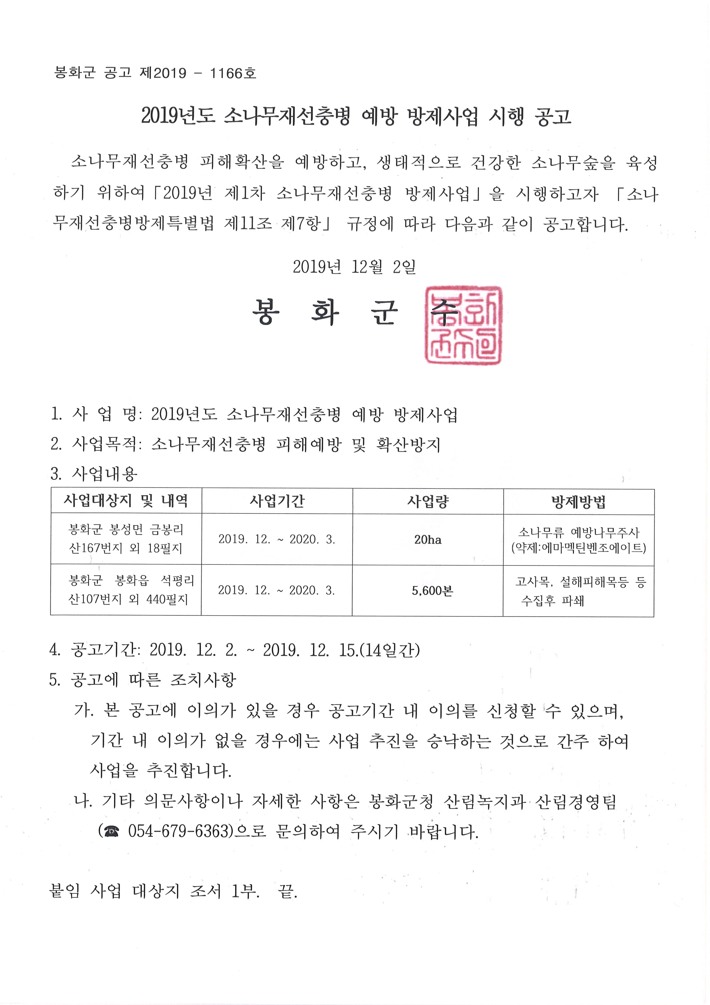 | 426 | 2019년 소나무재선충병 예방 방제사업 시행 공고 | 권현목 | 2019.12.09 | ![]() ![]() | 269 |