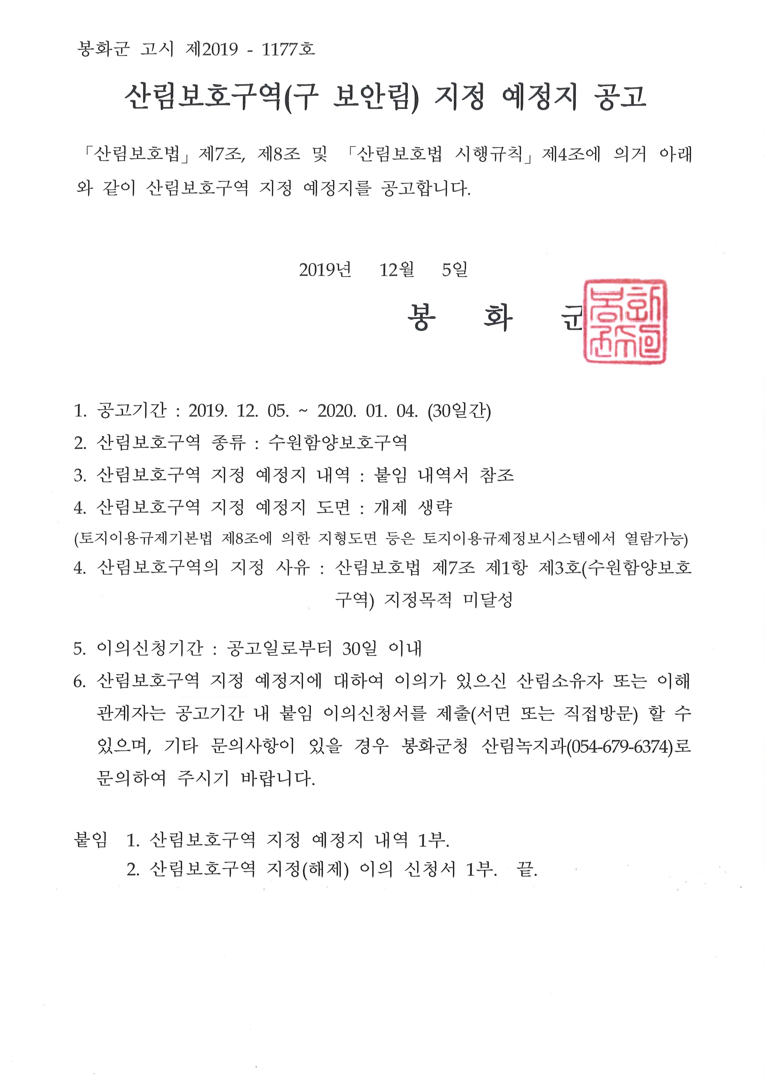 | 427 | 산림보호구역 지정 예정지 공고 | 권현목 | 2019.12.10 | ![]() ![]() ![]() | 340 |