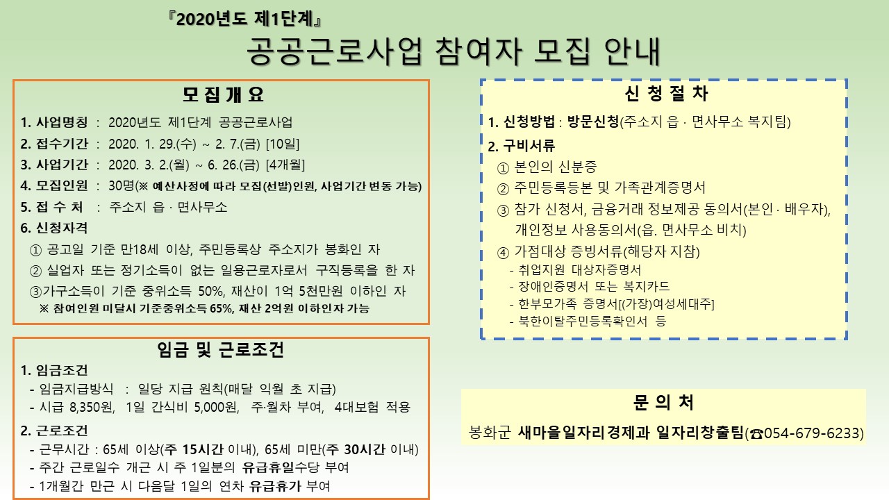 | 430 | 2020년도 제1단계 공공근로사업 참여자 모집 안내 | 권현목 | 2020.01.28 | ![]() ![]() ![]() ![]() | 291 |