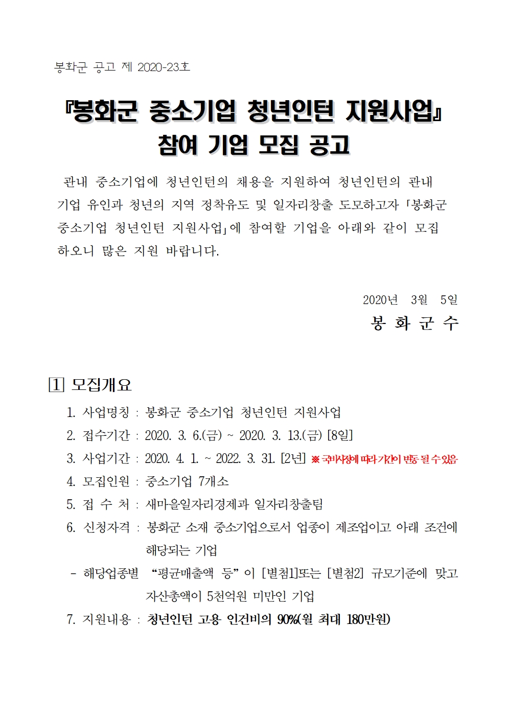| 441 | 봉화군 중소기업 청년인턴 지원사업 안내 | 권현목 | 2020.03.06 | ![]() ![]() ![]() ![]() ![]() ![]() ![]() | 293 |