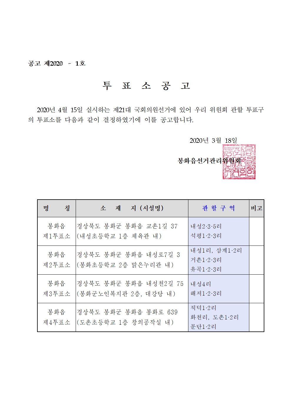| 442 | 제21대 국회의원선거 투표소 결정 공고문 | 권현목 | 2020.03.18 | ![]() | 311 |