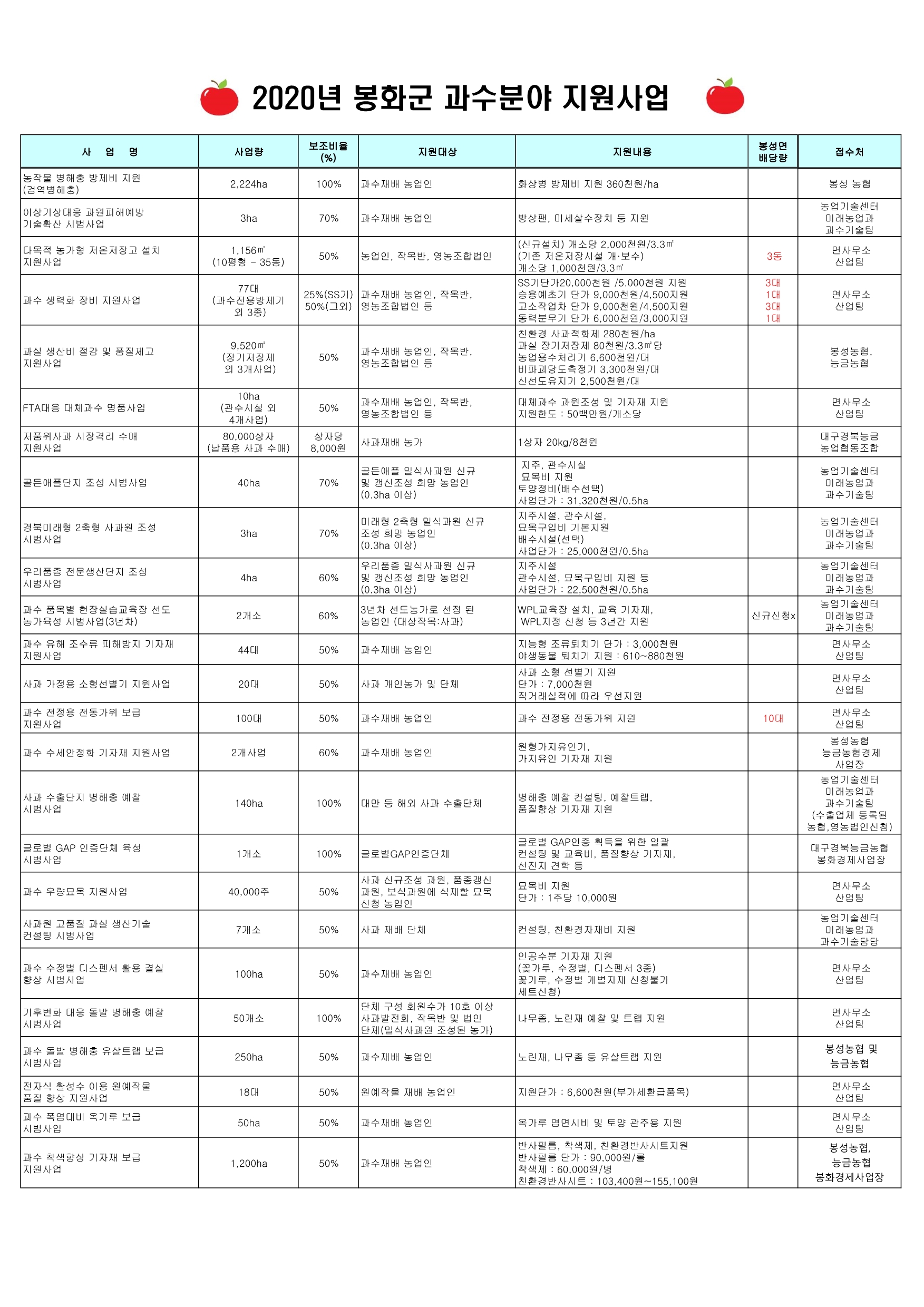 | 235 | 봉성면 2020년 과수분야 시범 및 지원사업 사업신청서 접수 | 김민석 | 2020.01.12 | ![]() | 248 |