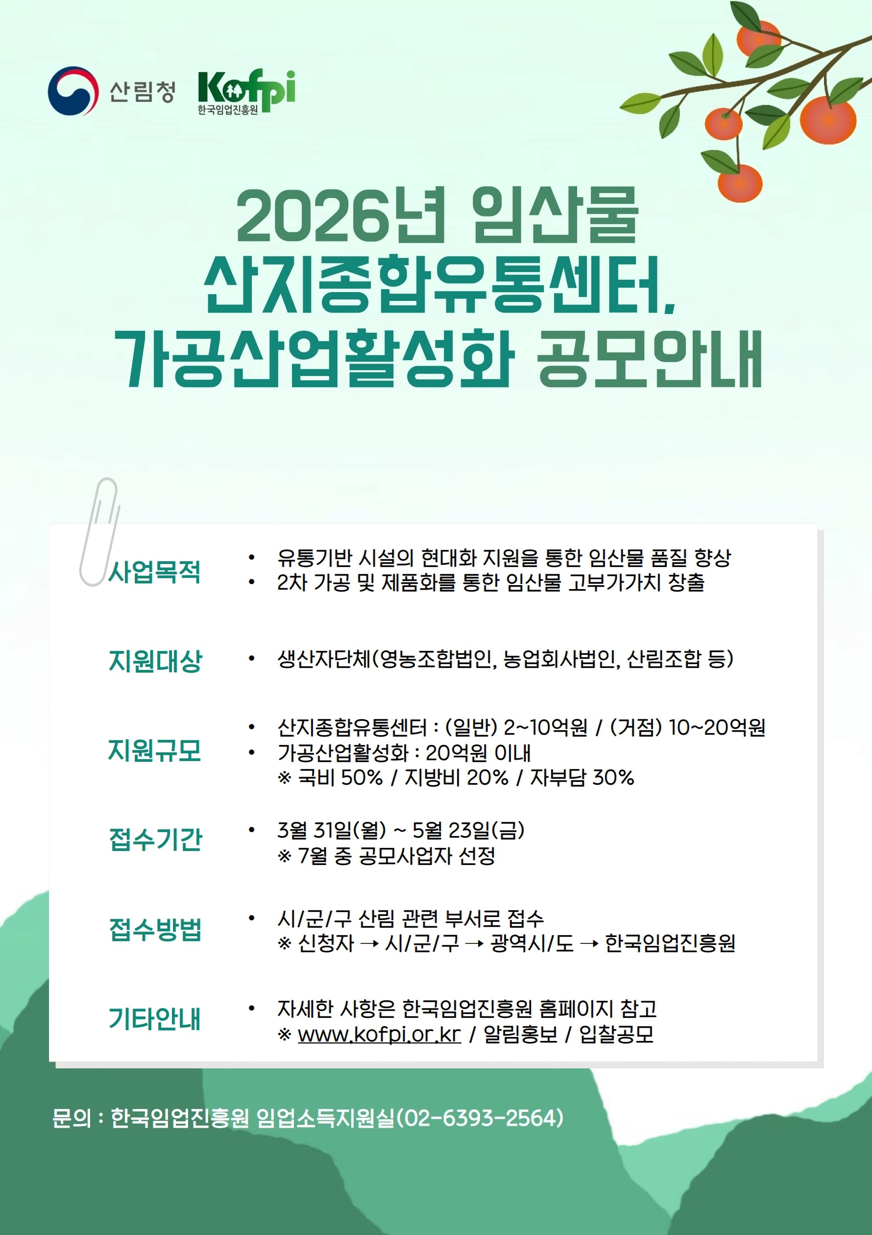 | 418 | 2026년 산림소득 유통,가공분야 공모사업 홍보 | 최시혁 | 2025.04.14 |    | 83 |