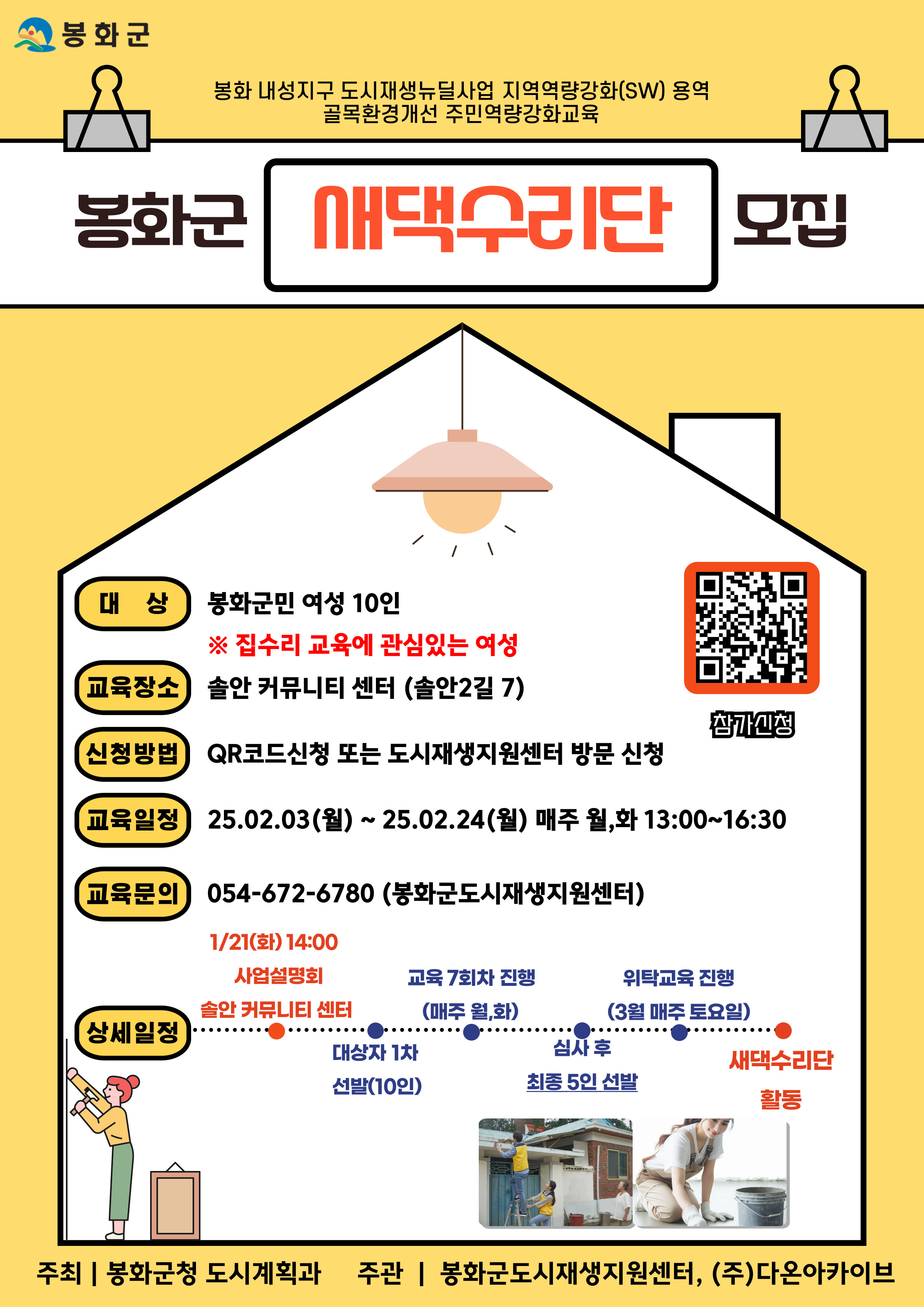| 351 | 「봉화 새댁수리단 모집공고」 안내 및 홍보 | 김정현 | 2025.01.20 | ![]() ![]() | 126 |