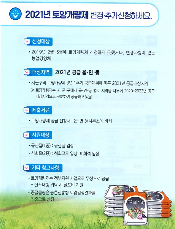 2021년 토양개량제(석회, 규산 등) 추가신청 접수하오니 신청하여 주시기 바랍니다.