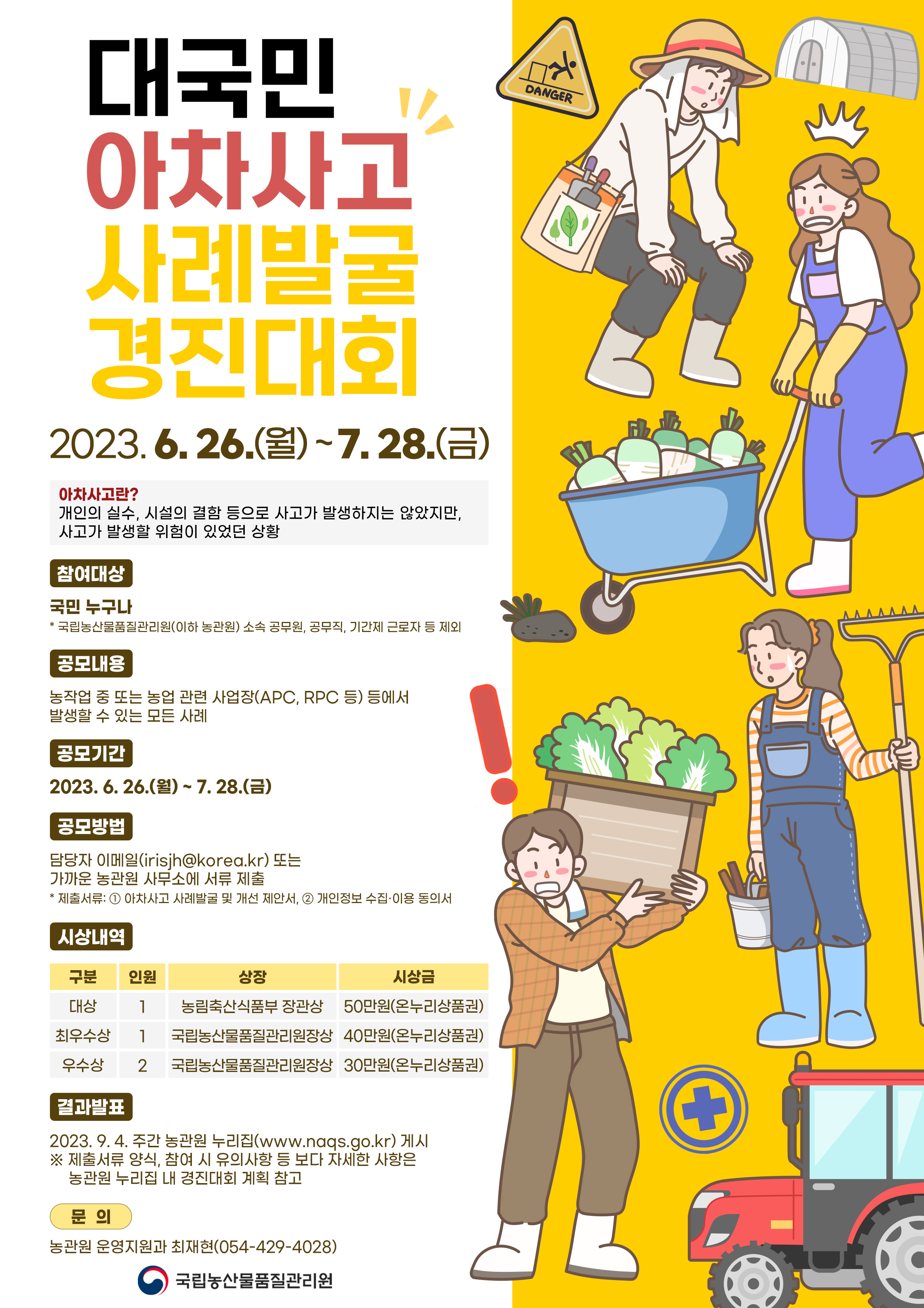 국립농산물품질관리원에서는 농업분야 전반에 중대재해에 대한 경각심을 고취하고 농업종사자들의 자발적인 안전 농업현장 조성 및 안전관리 의식 제고를 위해 대국민「아차사고 사례 발굴 경진대회」를 개최('23.6.26.~7.28.)하고 있습니다.