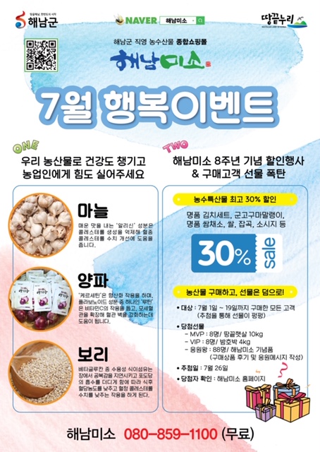 | 1215 | 해남군 직영 농수산물 쇼핑몰「해남미소」8주년 기념 이벤트 행사! | 권우현 | 2019.07.04 | ![]() | 319 |
