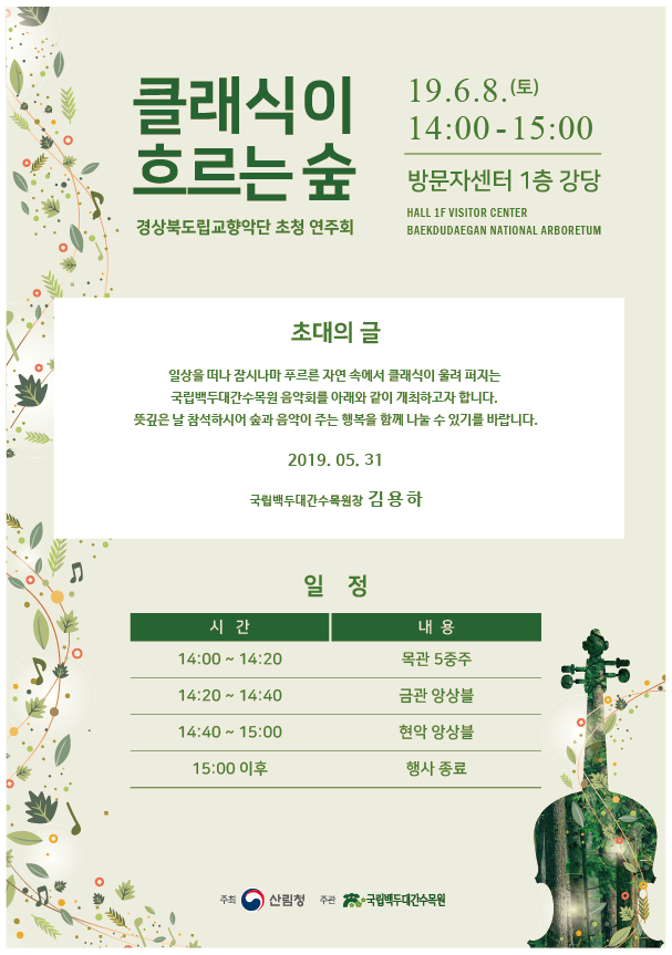 | 1200 | 국립백두대간수목원 클래식이 흐르는 숲 공연 안내 | 박민철 | 2019.06.05 | ![]() ![]() | 334 |