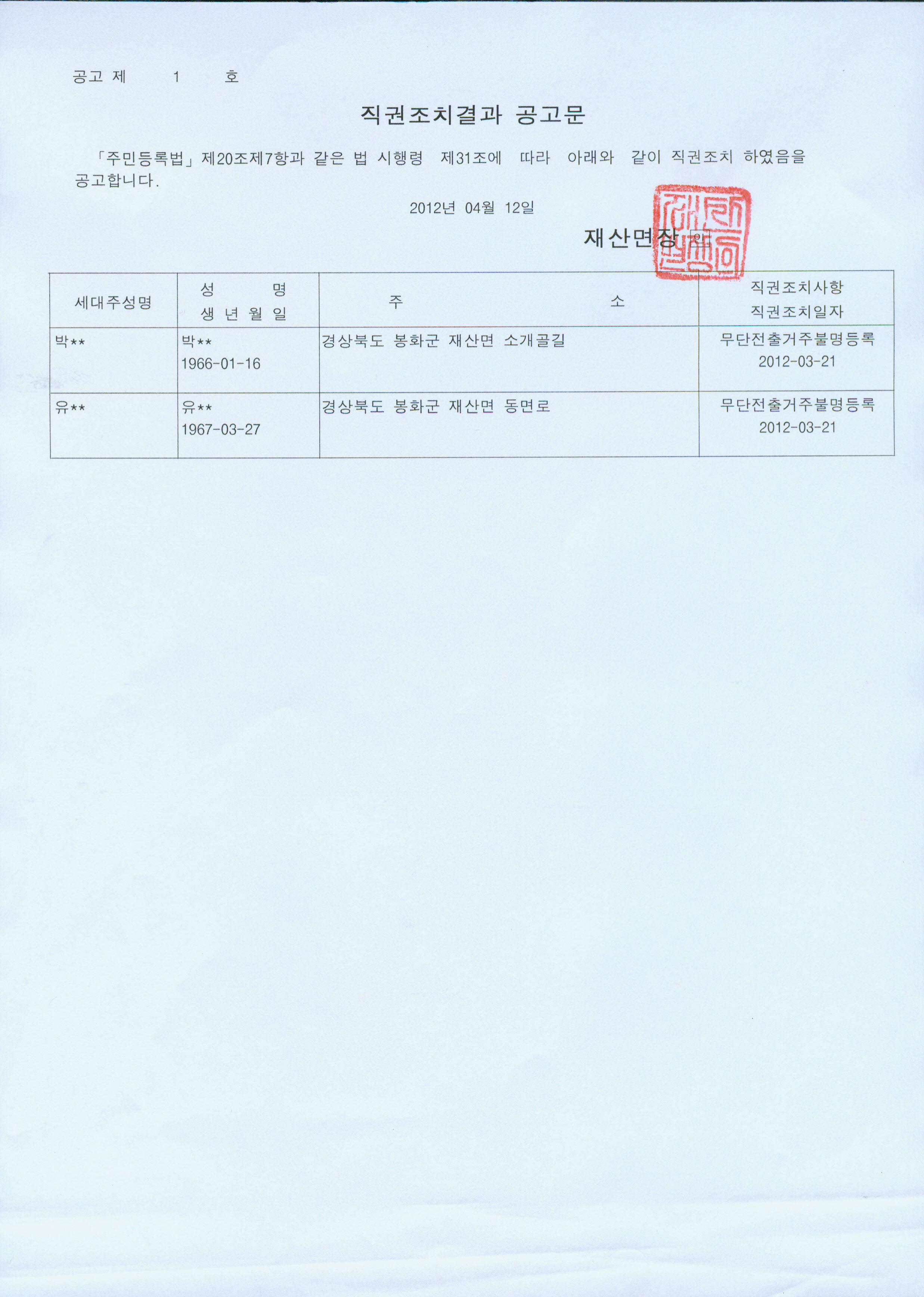 주민등록법 제20조제7항과 같은 법 시행령 제31조에 따라 아래와 같이 직권조치 하였음을 공고합니다.
