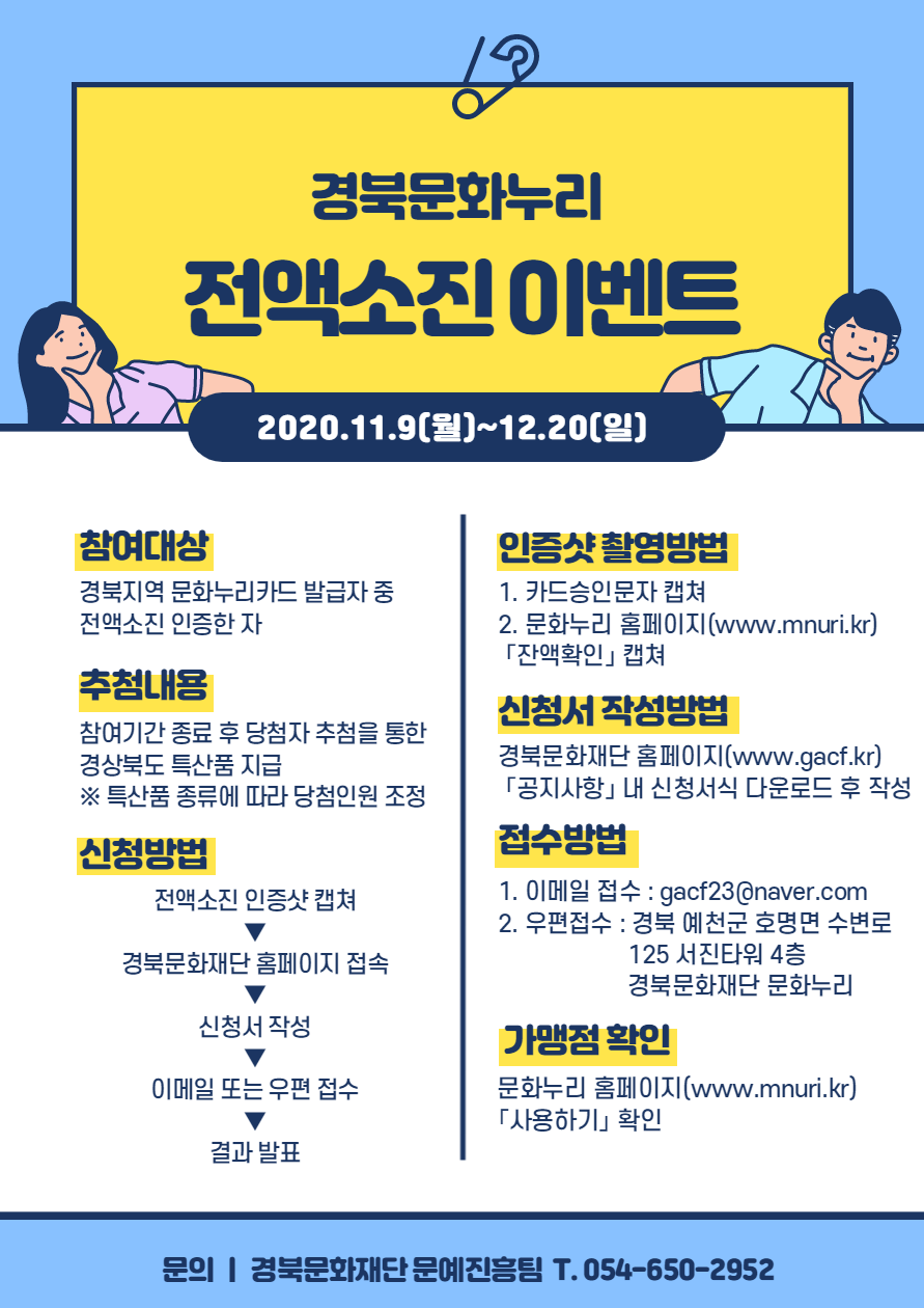 | 423 | 문화누리카드 전액소진 이벤트 안내 | 곽경찬 | 2020.12.03 | ![]() | 183 |