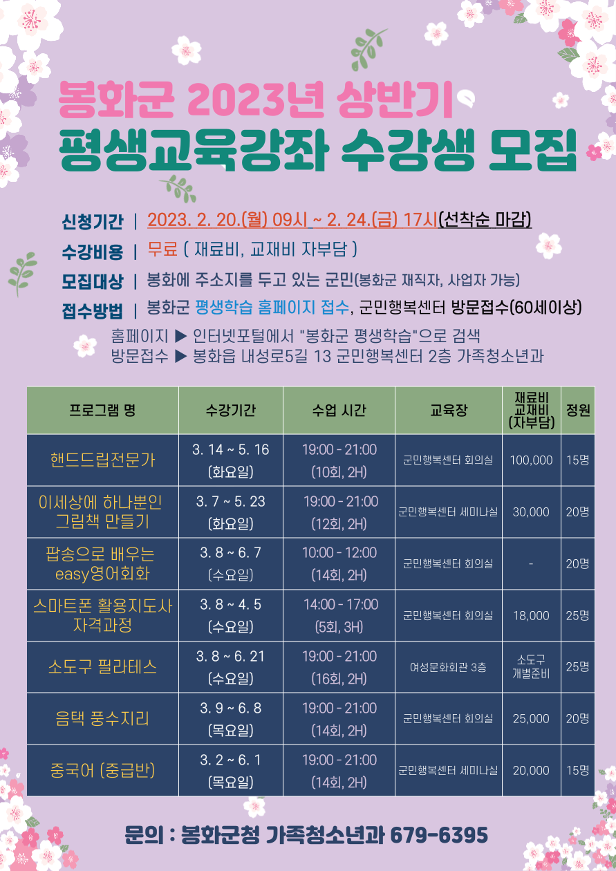| 624 | 20203년 상반기 평생교육강좌 수강생 모집 | 강민구 | 2023.02.07 | ![]() | 172 |