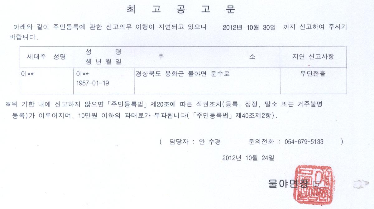 2012년 대선대비 주민등록 특별사실조사에 따른 최고 공고문을 다음과 같이 게시합니다.