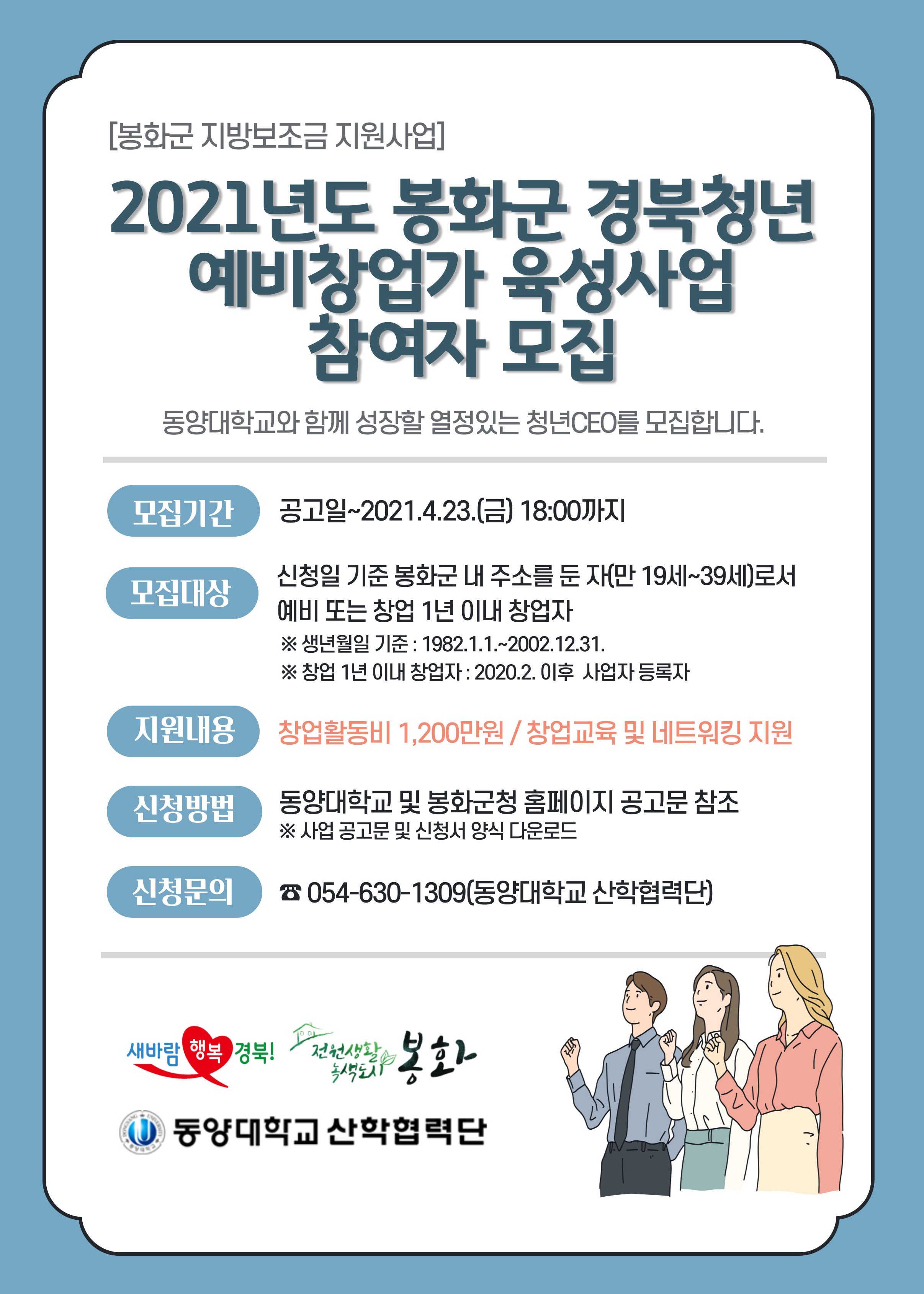 2021년도 「봉화군 경북청년예비창업가 육성사업」 참여자를 모집하오니, 관심있는 분들은 신청하여 주시기 바랍니다.