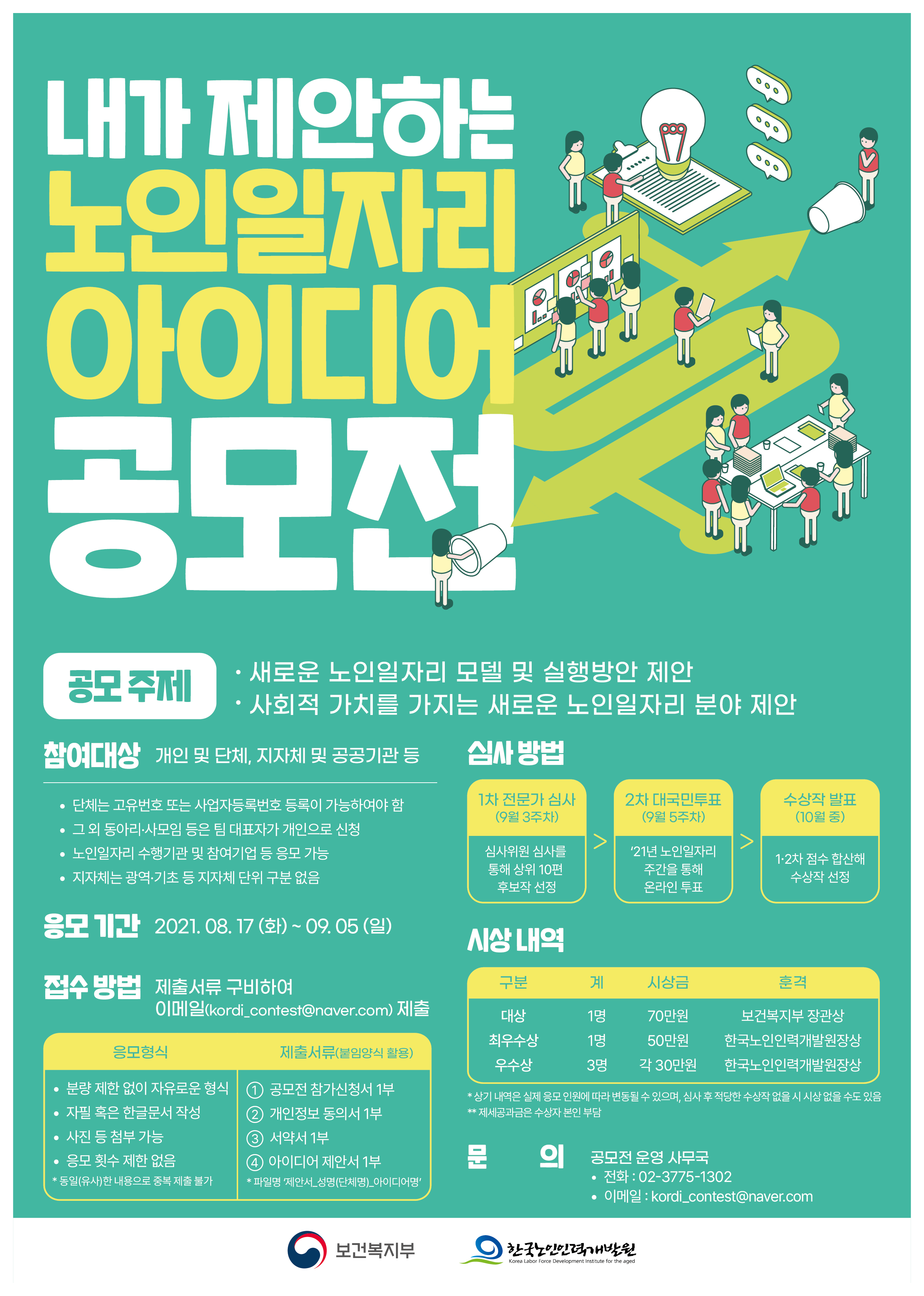 한국노인인력개발원에서 새로운 노인일자리 모델을 발굴하고 노인인력이 필요한 일자리 분야를 파악하기 위하여 '내가 제안하는 노인일자리 아이디어 공모전'을 개최합니다. 공모전에 관심 있으신 분은 붙임 문서를 참조하여 참여 하시기 바랍니다.