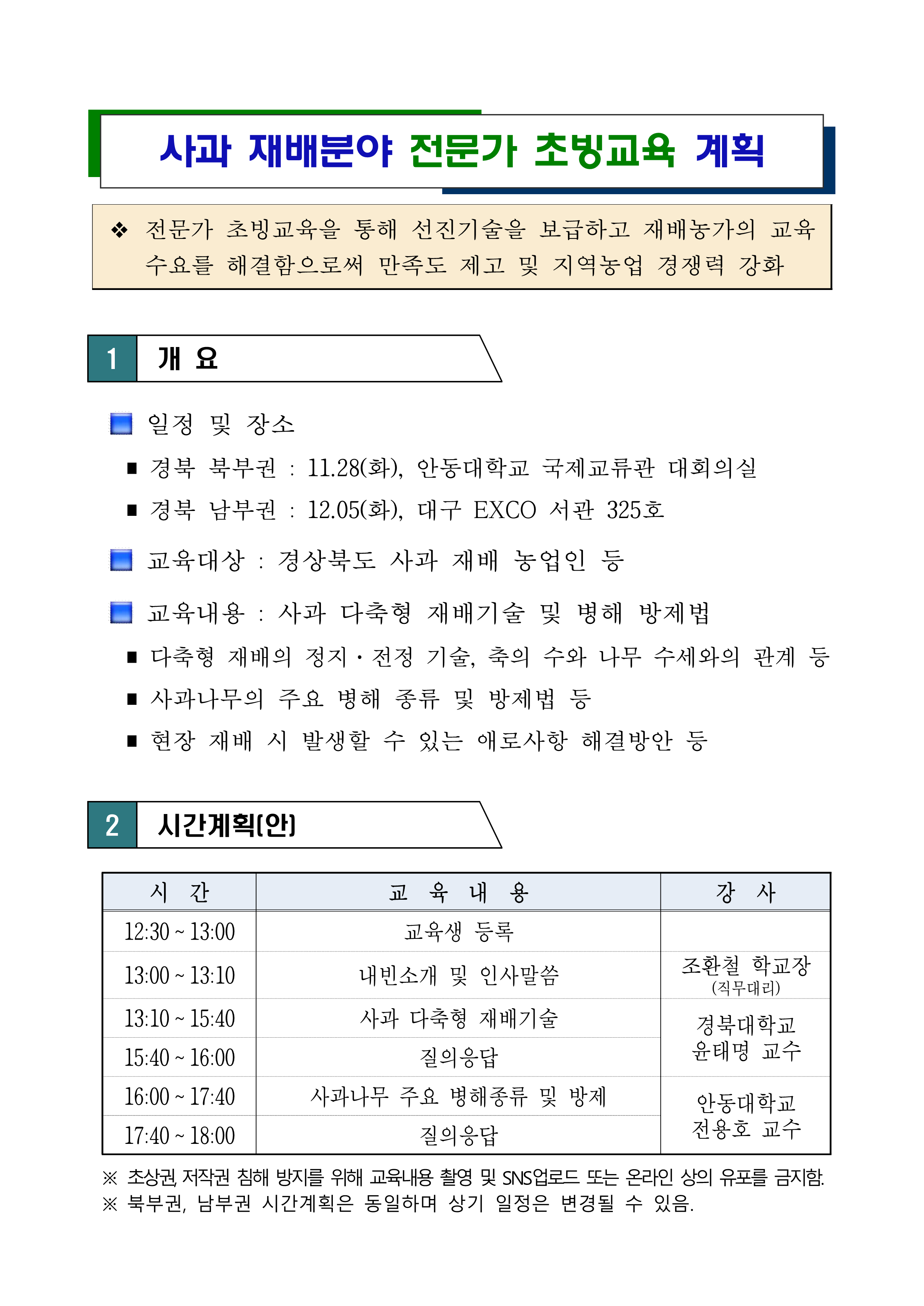 가. 일정 및 장소(붙임참조) 1) 경북 북부권 : 2023. 11. 28.(화), 12:30 ~ / 안동대학교 국제교류관 대회의실 2) 경북 남부권 : 2023. 12. 05.(화), 12:30 ~ / 대구 EXCO 서관 325호 ※ 교육내용은 동일함나. 강 사 : 2명(경북대학교 윤태명 교수, 안동대학교 전용호 교수)다. 교육내용 : 사과 다축형 재배기술, 사과나무 주요 병해종류 및 방제 등