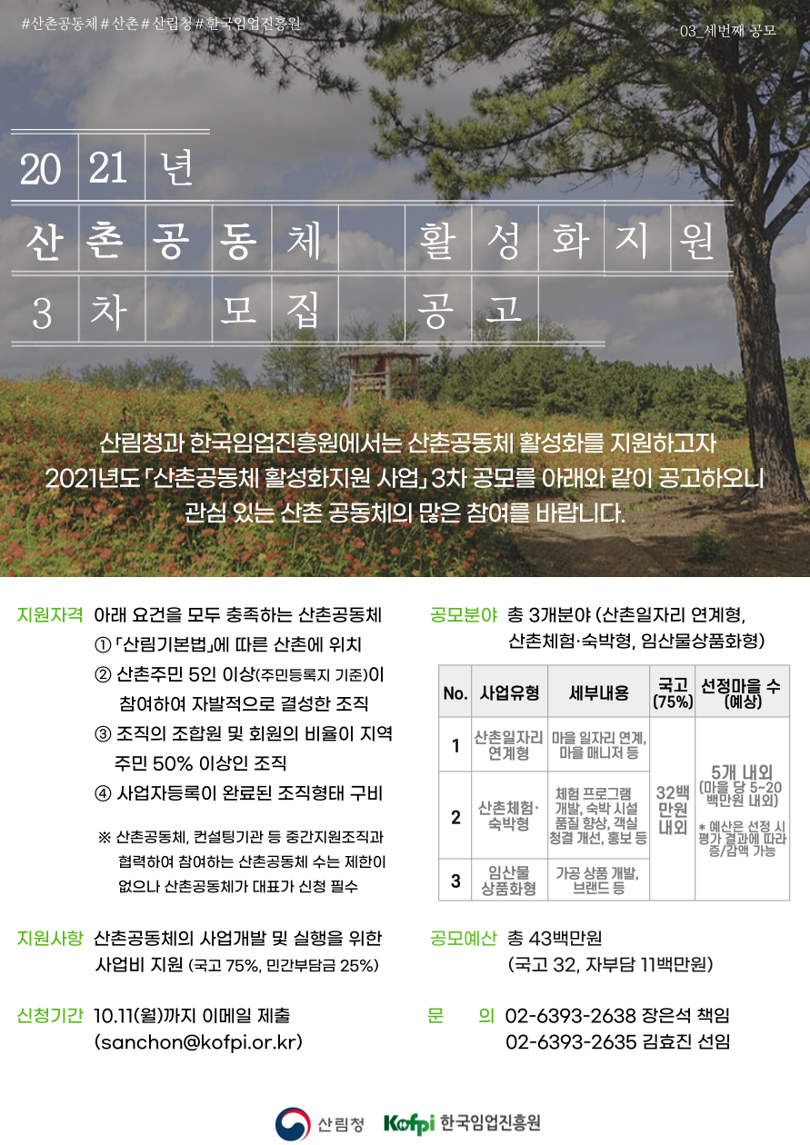 | 800 | 2021년 산촌공동체 활성화지원사업 3차 모집공고 | 김서윤 | 2021.09.29 | ![]() ![]() ![]() ![]()  | 135 |