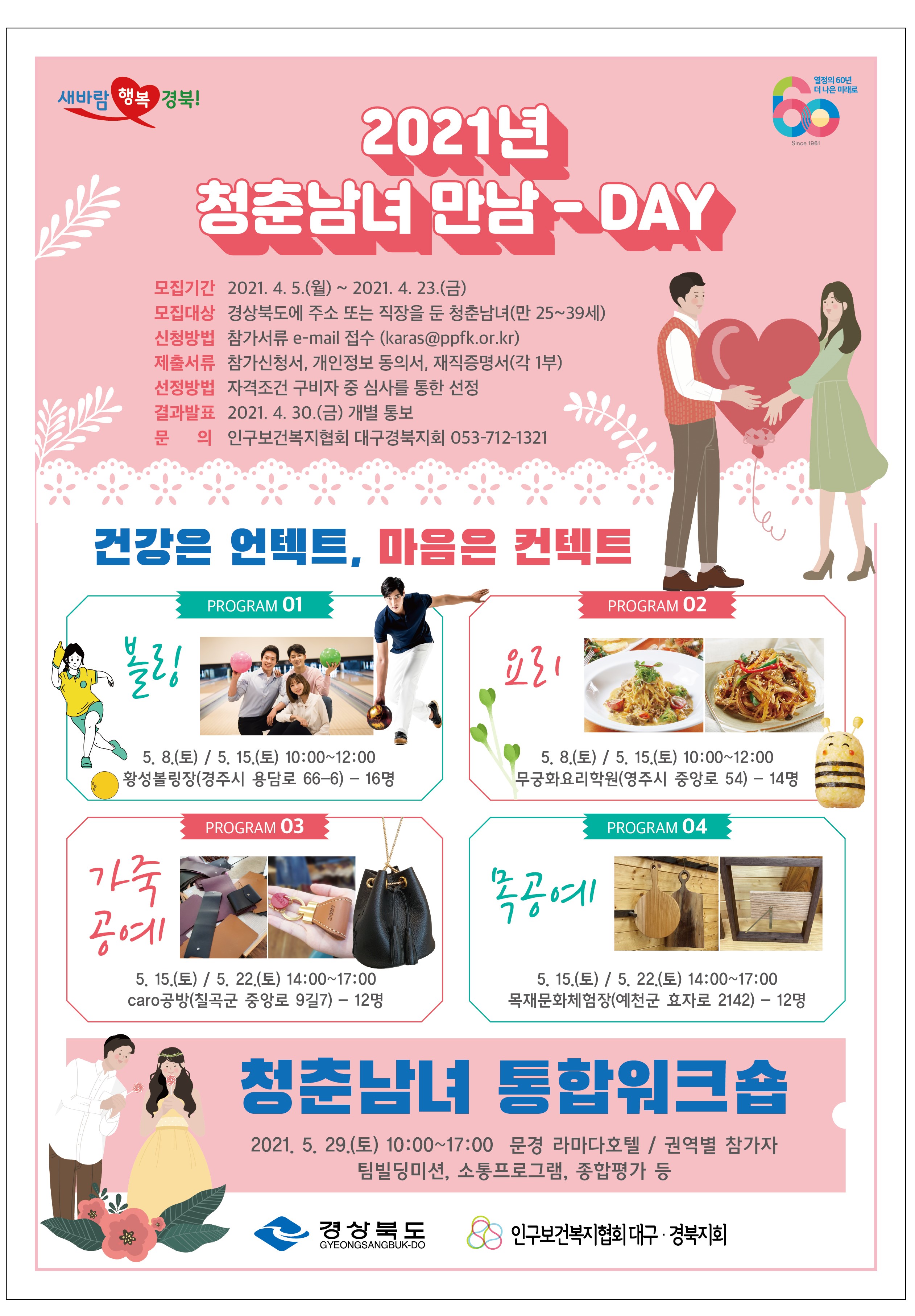 | 670 | 2021년 경상북도 청춘남녀 만남지원(동아리 활동) | 권현목 | 2021.04.06 | ![]() ![]() ![]() | 285 |