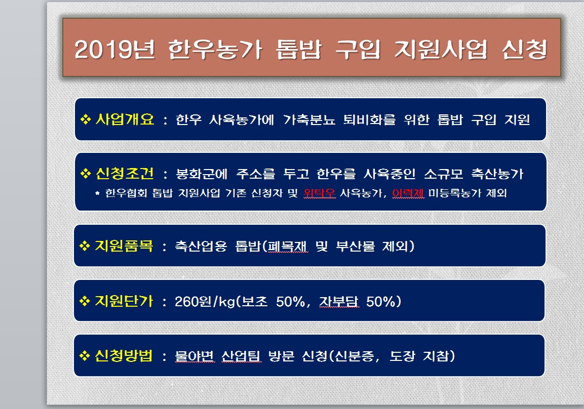 | 338 | 2019년 한우농가(소규모) 톱밥 구입 지원사업 신청 안내 | 송지웅 | 2019.08.05 | ![]() ![]() | 280 |