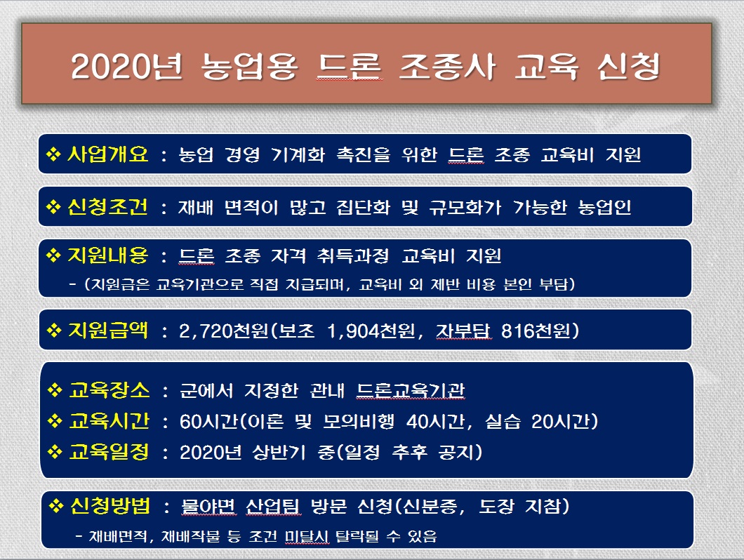 | 339 | 2020년 농업용 드론 조종사 교육 신청 안내 | 송지웅 | 2019.08.08 | ![]() ![]() | 278 |