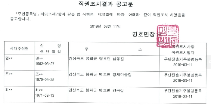 | 368 | 무단전출에 대한 직권조치 공고문 (최*우) | 박정환 | 2019.03.28 | ![]() | 289 |