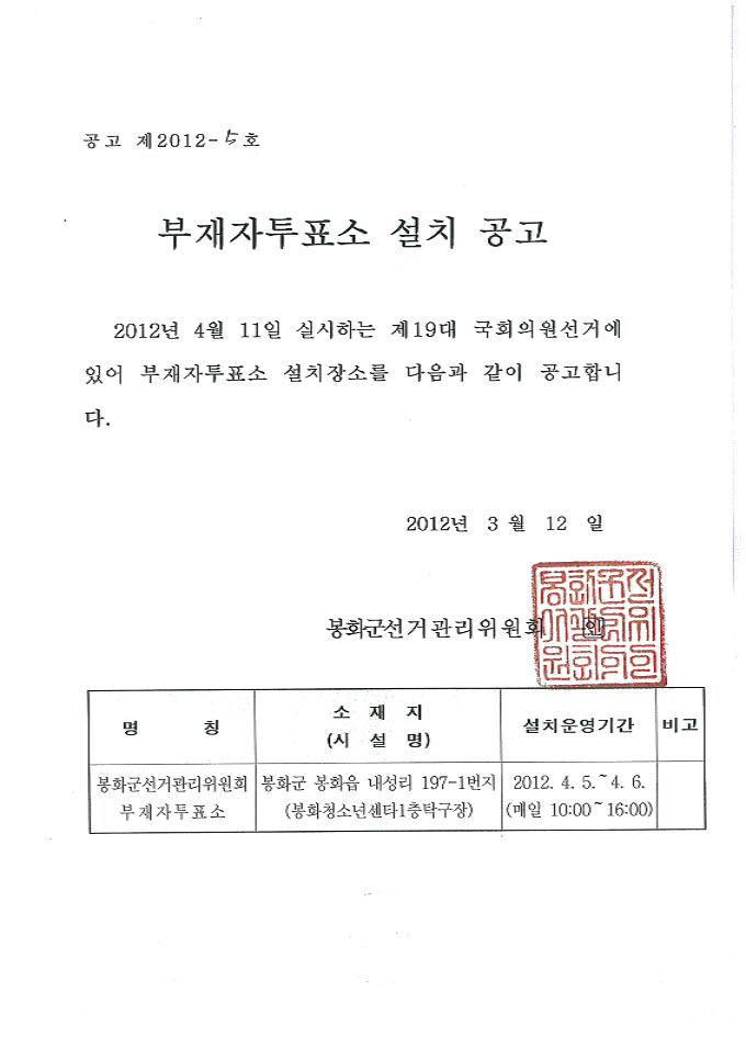 | 62 | 제19대 국회의원선거 관련 부재자신고 안내 | 명호면 | 2012.03.16 | ![]() ![]() ![]() | 3307 |