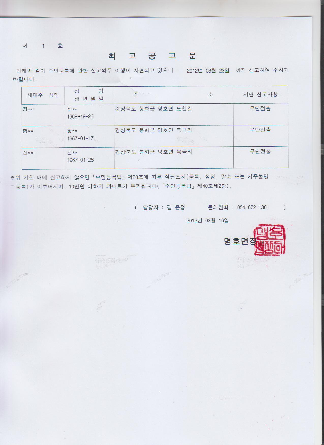 | 63 | 2012년 주민등록 일제정리에 따른 최고공고문 게시 | 명호면 | 2012.03.16 | ![]() | 3361 |