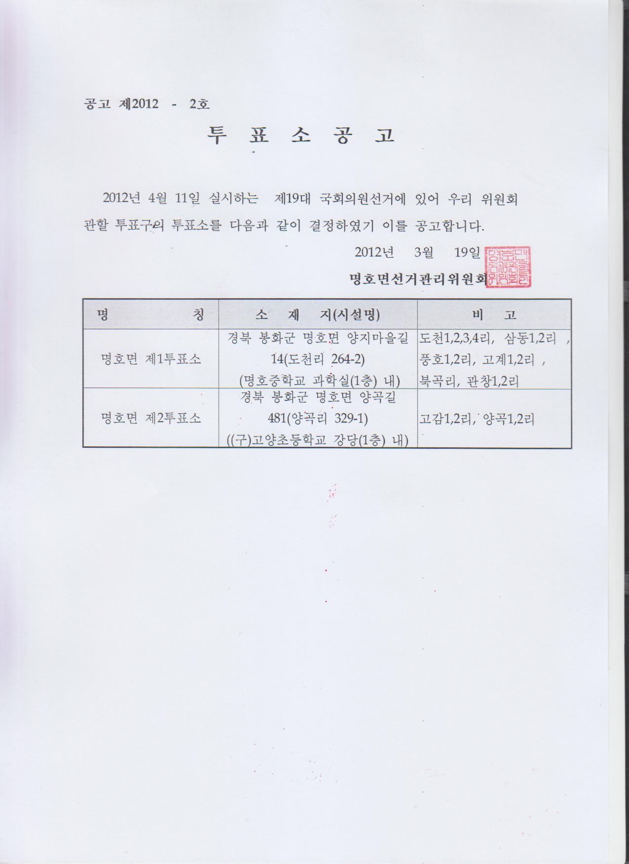 | 64 | 제19대 국회의원선거 관련 투표소 공고 | 명호면 | 2012.03.19 | ![]() | 3576 |