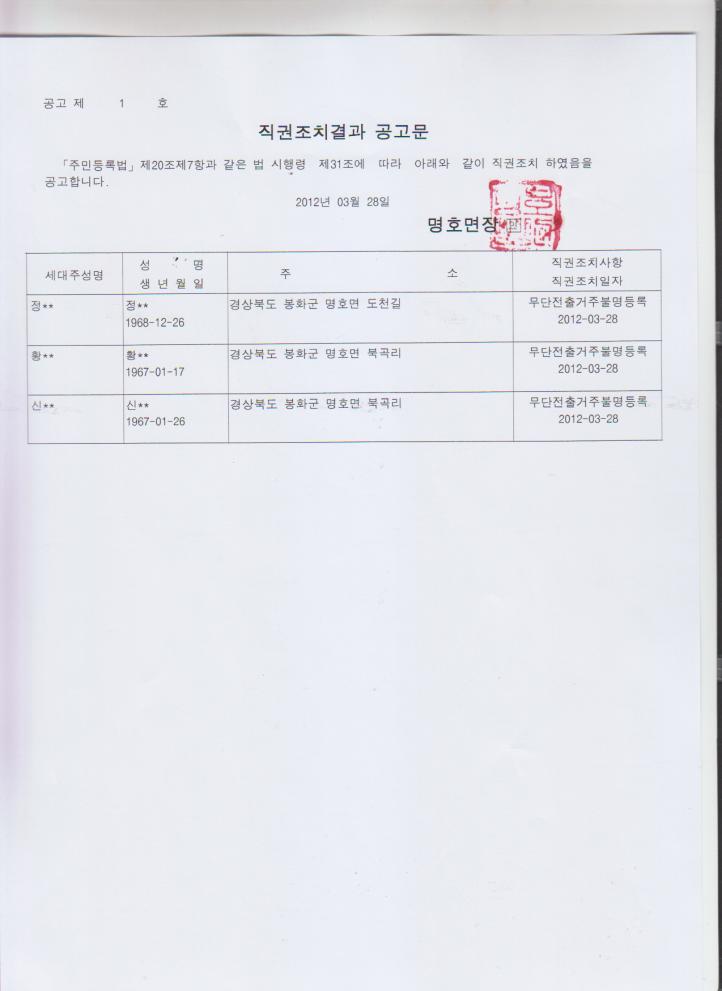 | 65 | 주민등록 일제정리 직권조치결과 공고문 | 명호면 | 2012.03.29 | ![]() | 3477 |