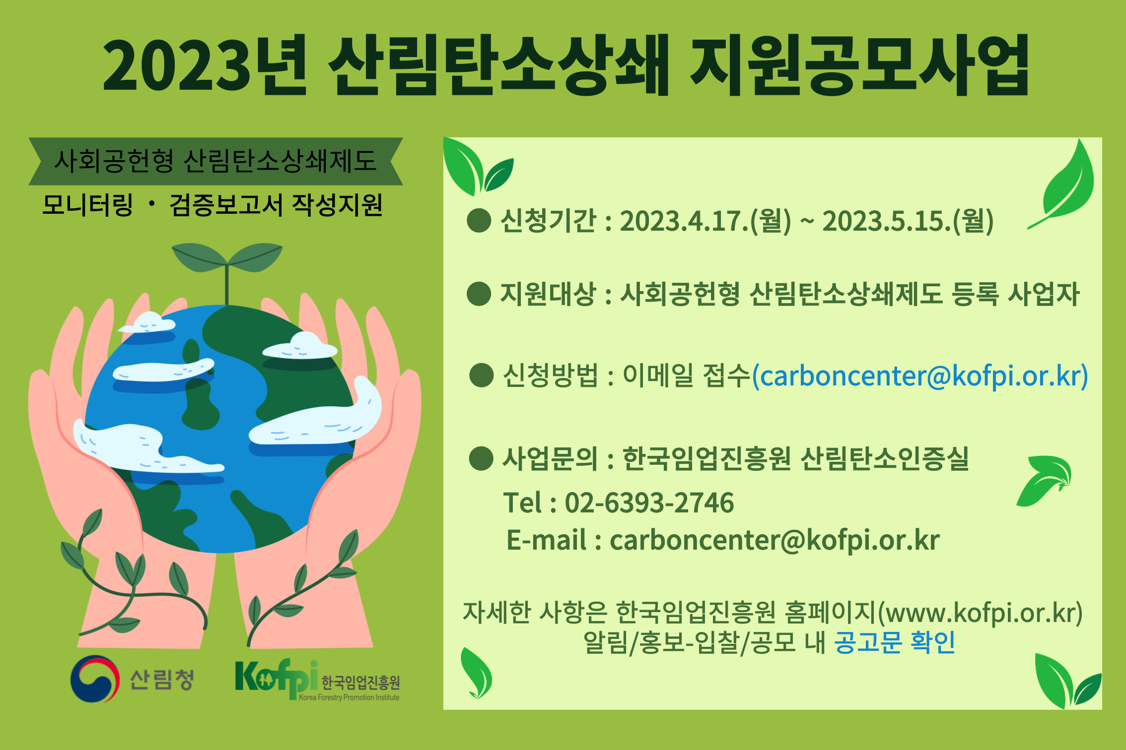 | 775 | 「2023년 사회공헌형 산림탄소상쇄사업 공모사업」 모집 안내 홍보 | 엄수현 | 2023.04.28 | ![]() ![]() | 149 |