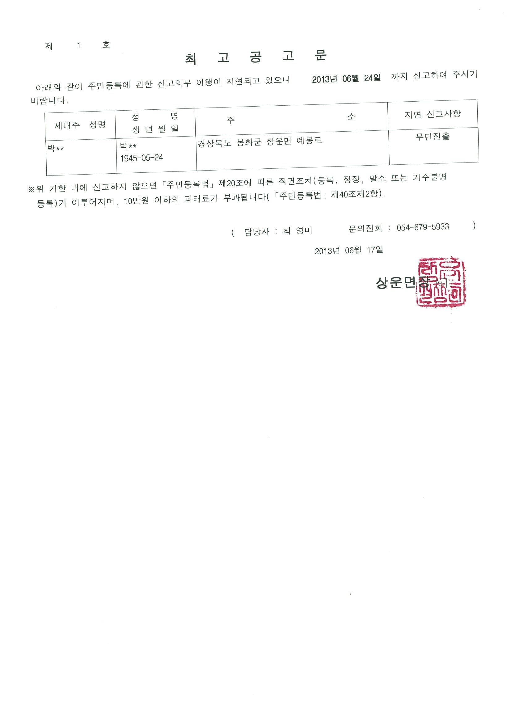 주민등록 신고지연자에 대하여 다음과 같이 최고 공고하니 2013년 6월 24일까지 신고하시기 바랍니다.