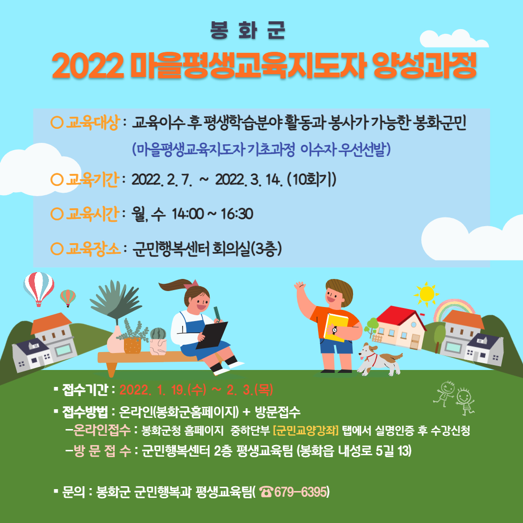 | 396 | 2022년 봉화군 마을평생교육지도자 양성과정 안내 | 권태욱 | 2022.01.23 | ![]() ![]() | 154 |