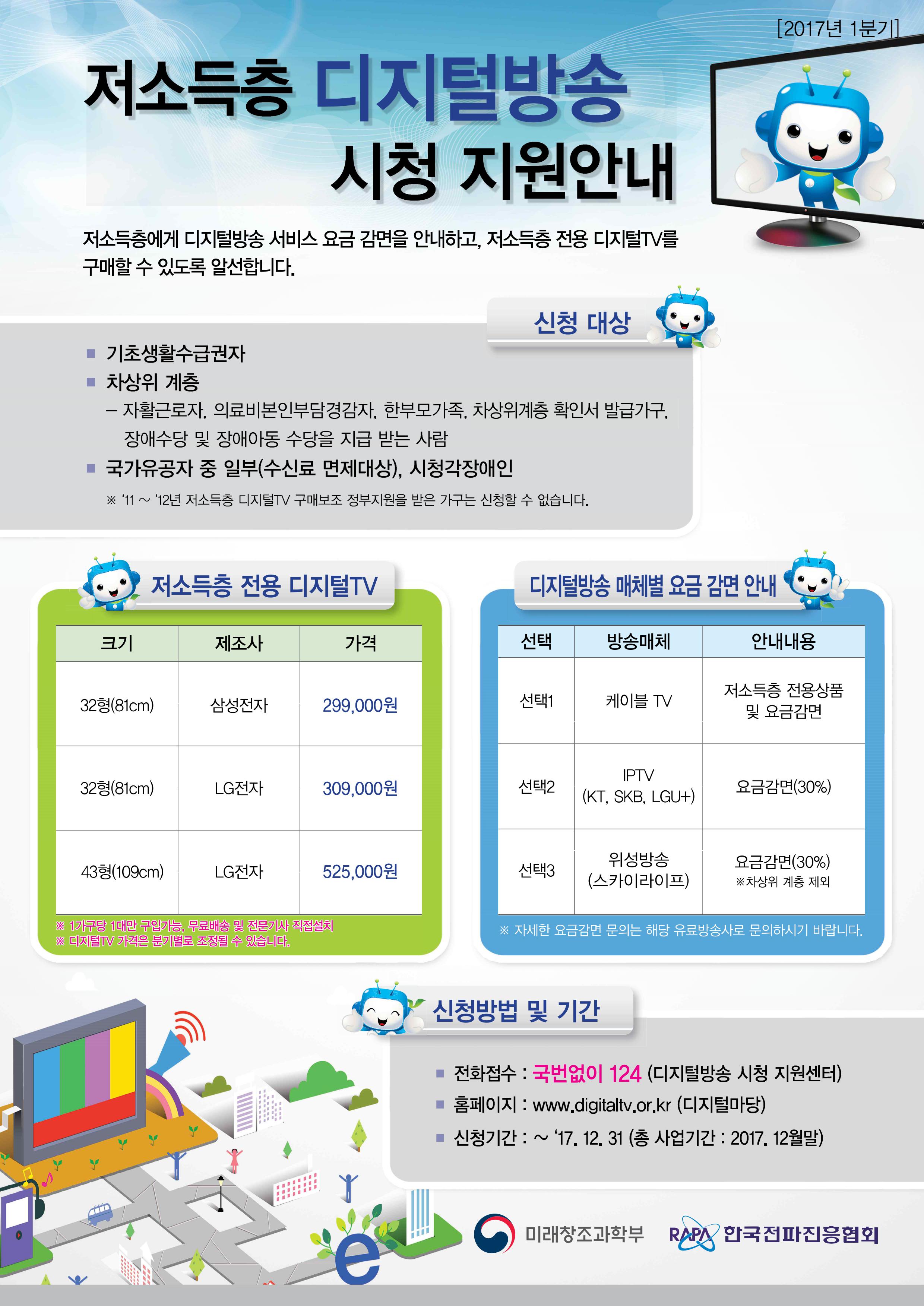 | 121 | 저소득층 디지털방송 시청 지원 안내 | 안수영 | 2017.02.13 | ![]() ![]() | 852 |