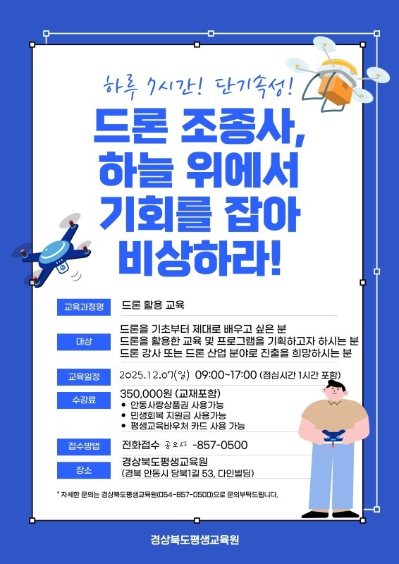 | 754 | [경상북도평생교육원] 드론활용교육 - 평생교육이용권사용가능 -12월7일 일요일 단하루 | 임효정 | 2025.11.10 | ![]() | 18 |