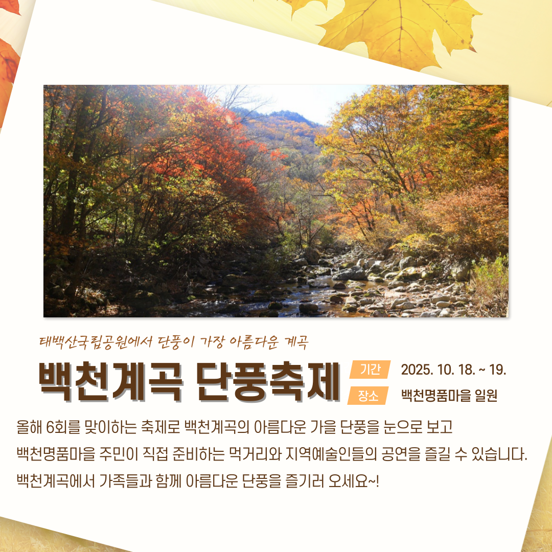 태백산국립공원에서 단풍이 가장 아름다운 백천계곡에서 그곳에 사는 마을주민과 소박한 단풍축제를 개최합니다.