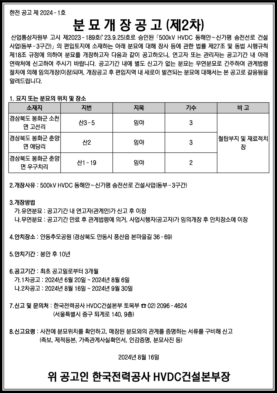 붙임과 같이 봉화군 소천면 고선리 산3-5 외 2필지에 대하여 분묘개장공고(2차)를 시행하오니,