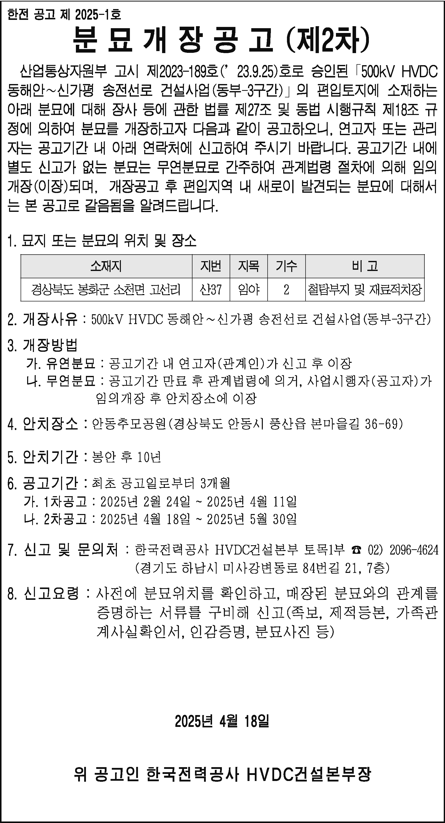 제목분묘개장공고 2차(봉화군 소천면 고선리 산37)