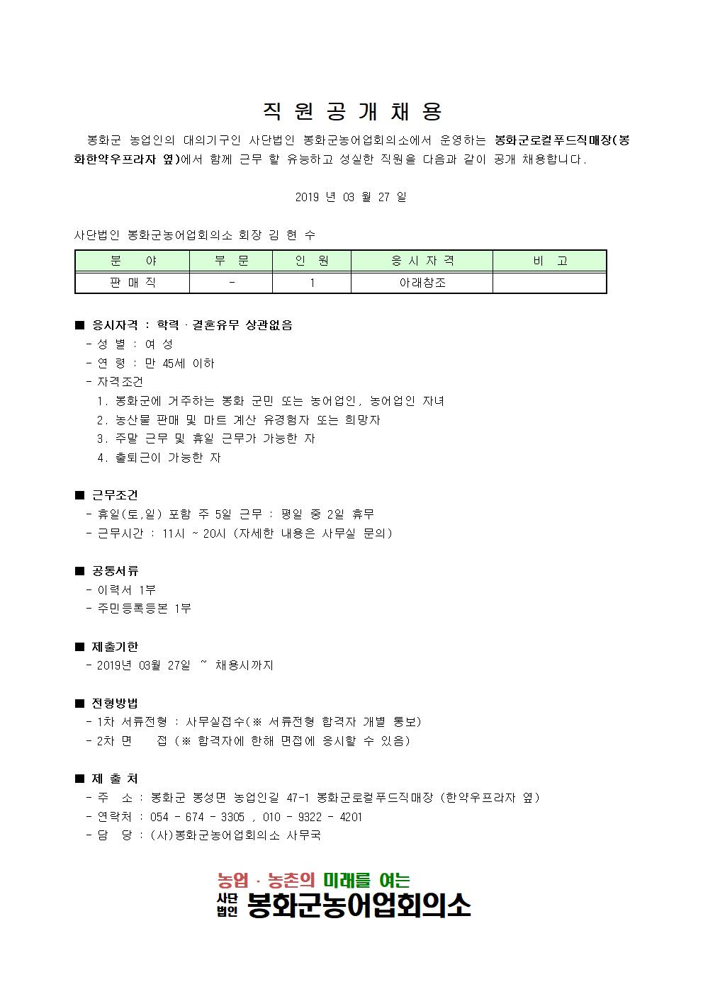 제목(채용완료)봉화로컬푸드직매장 / 판매직