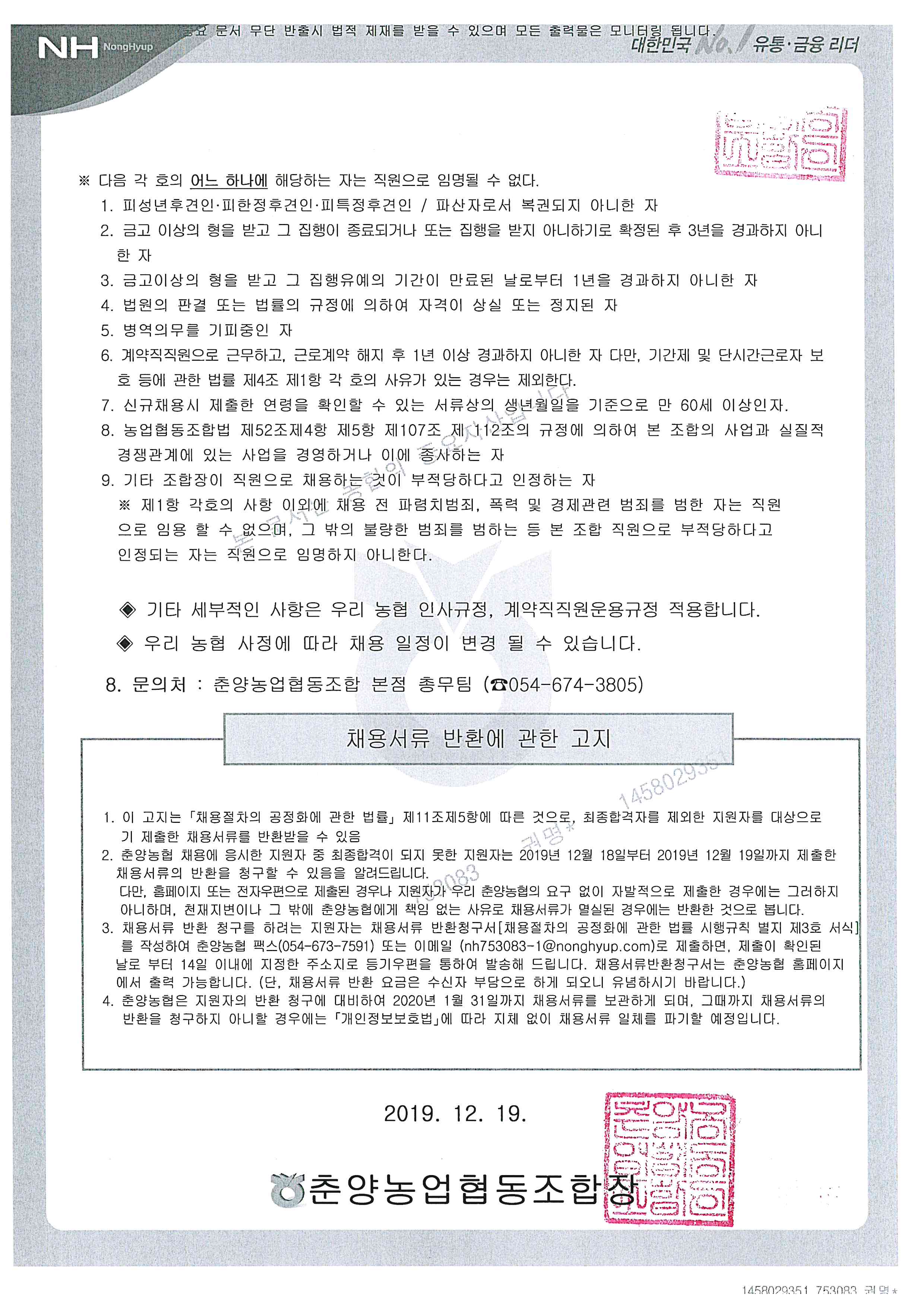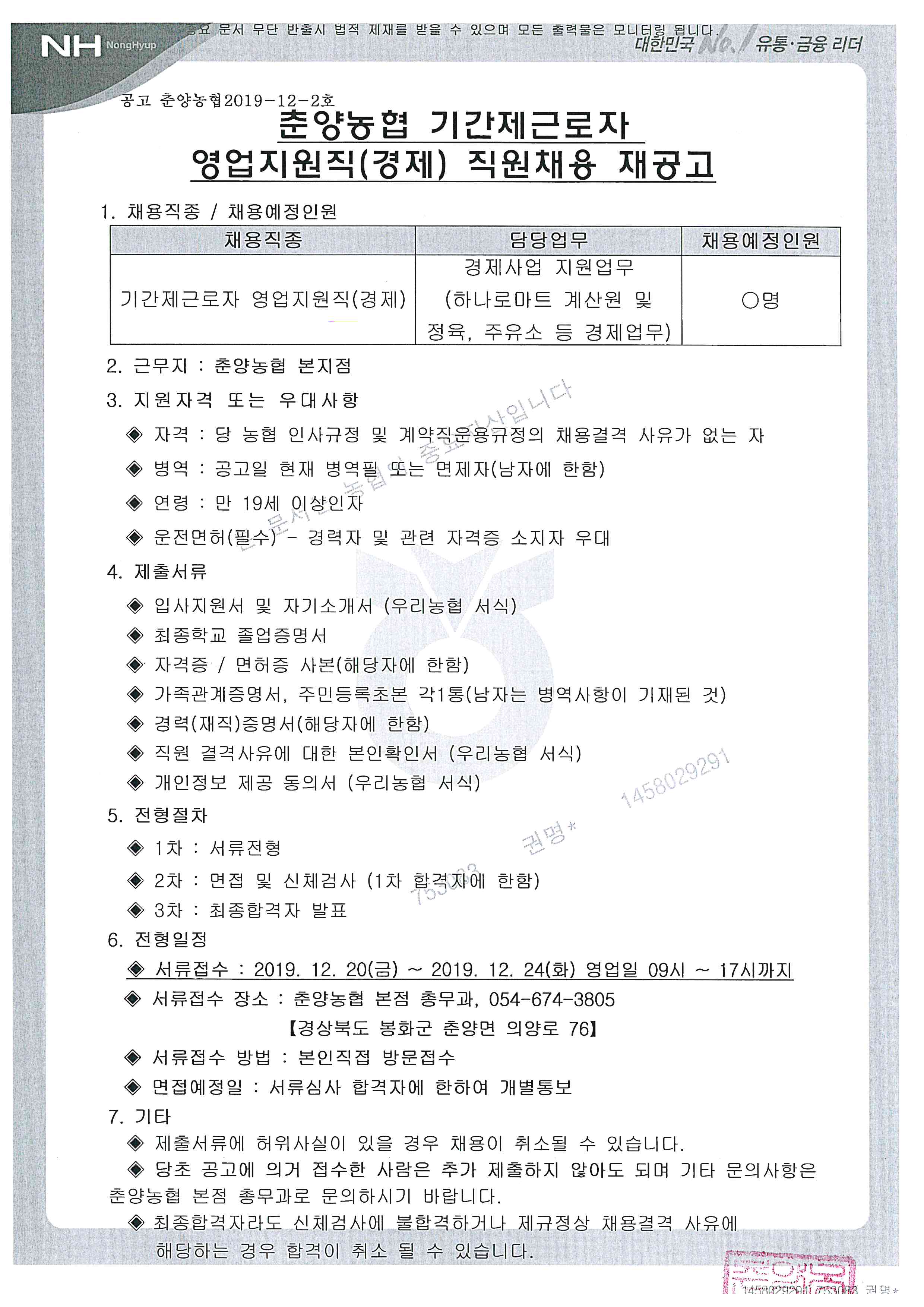 제목춘양농협 기간제근로자 영업지원직(경제)직원 채용 재 공고(접수:~12.24까지)