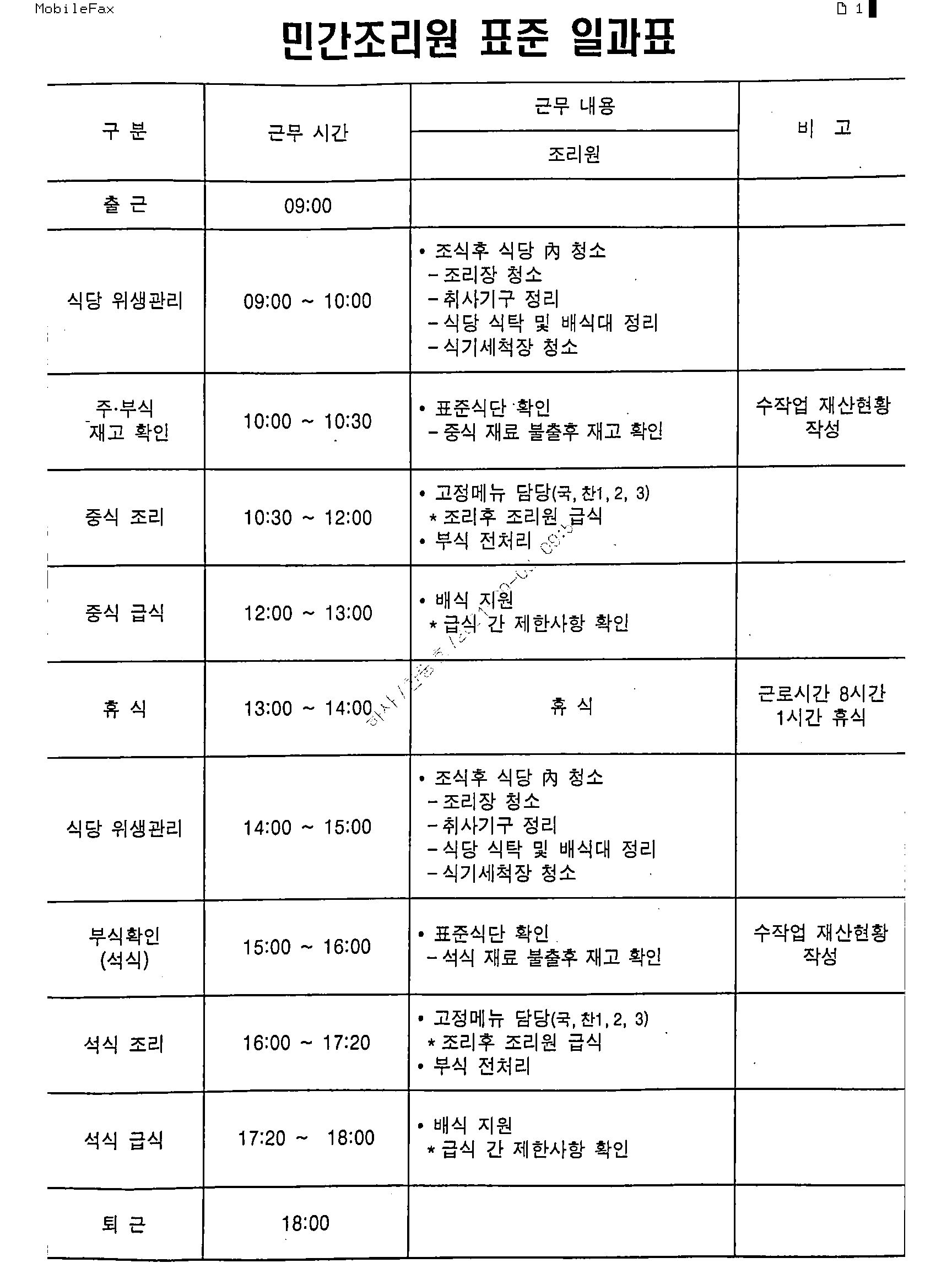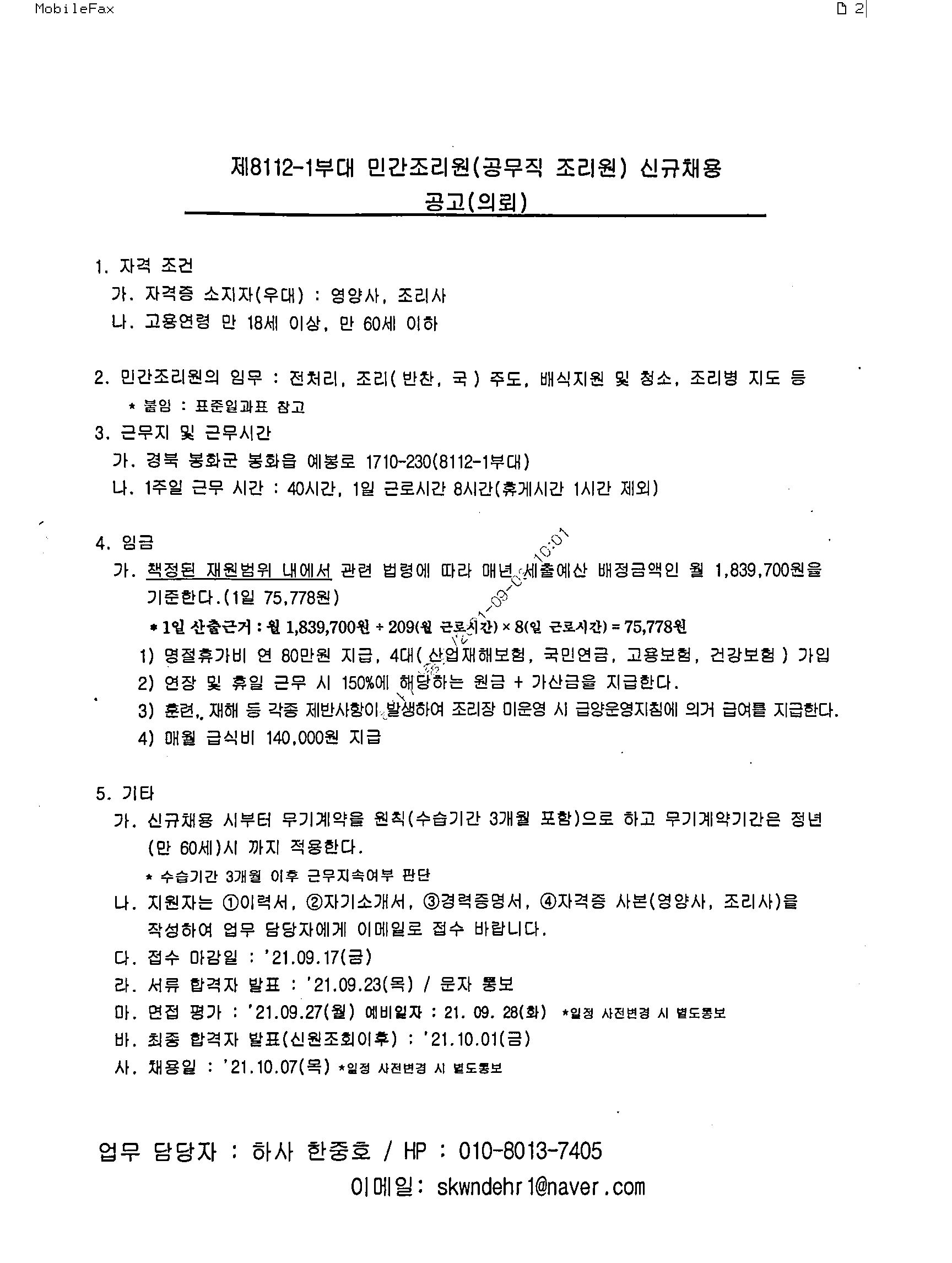 2. 민간조리원 임무 : 전처리, 조리(반찬, 국) 주도, 배식지원 및 청소, 조리병 지도 등
