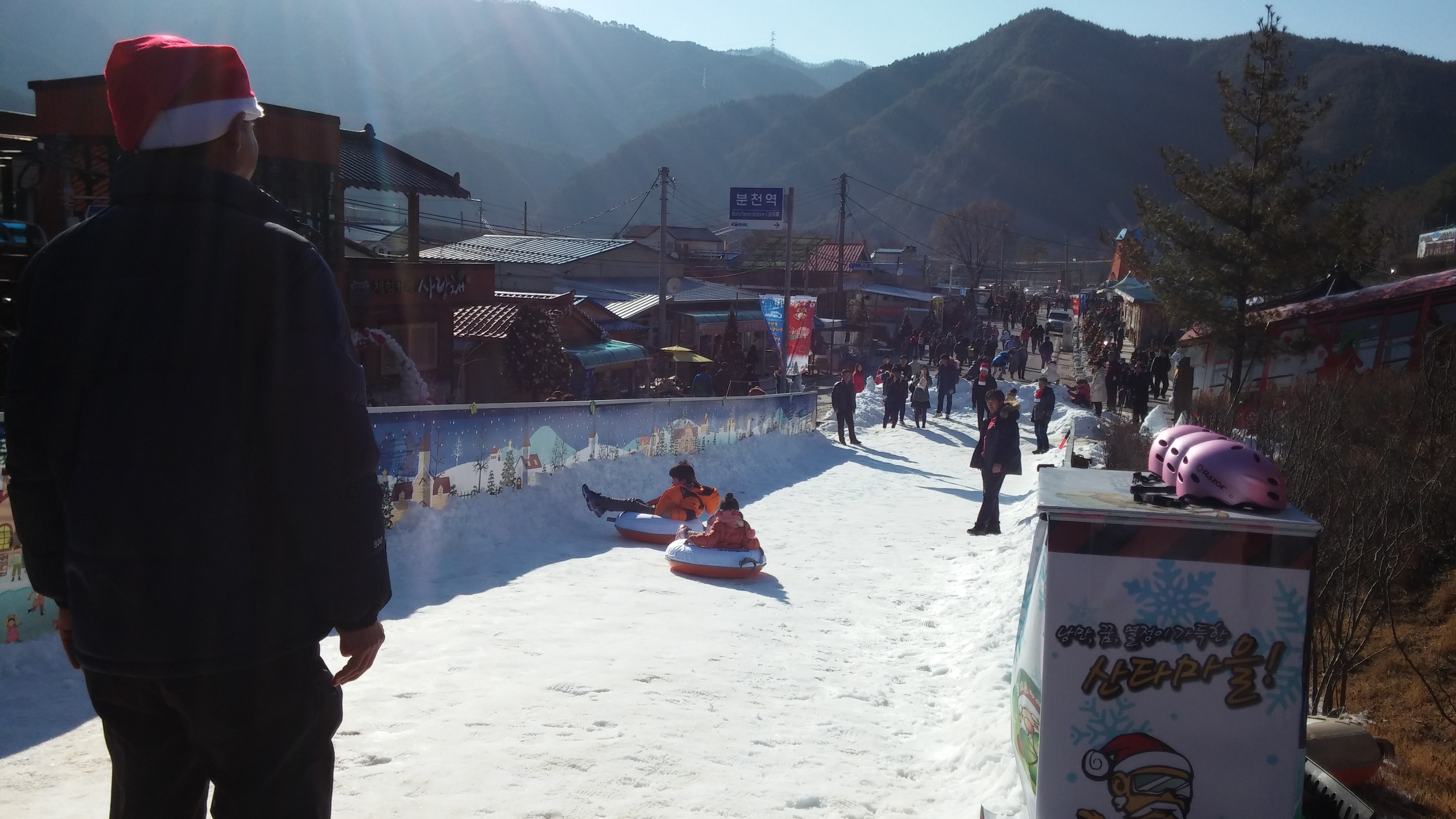방문객들이 신나게 눈썰매를 타는 모습입니다.