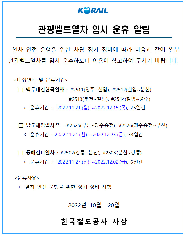| 51 | 관광열차 임시 운휴 알림 | 류선미 | 2022.10.28 | ![]() | 855 |